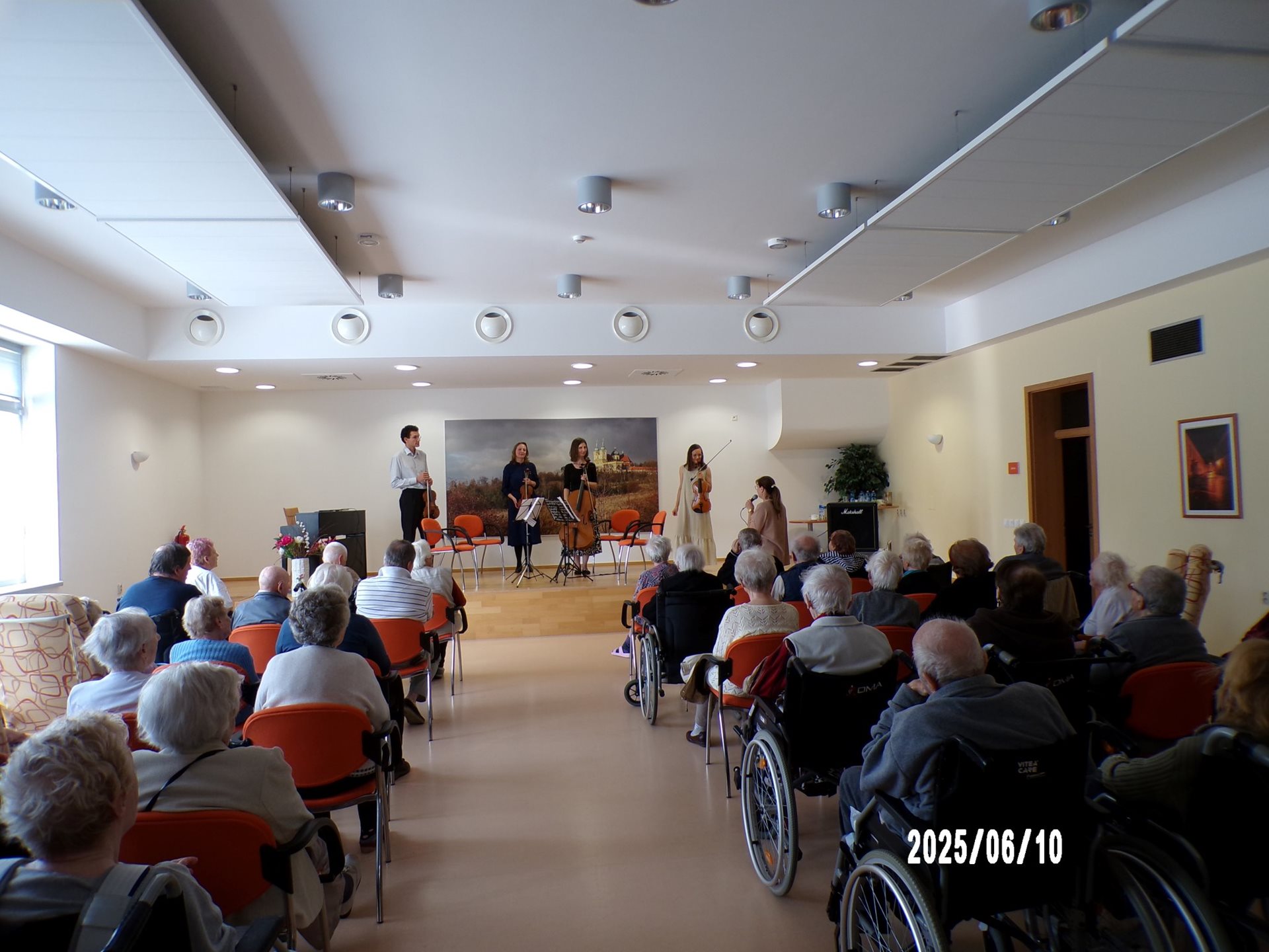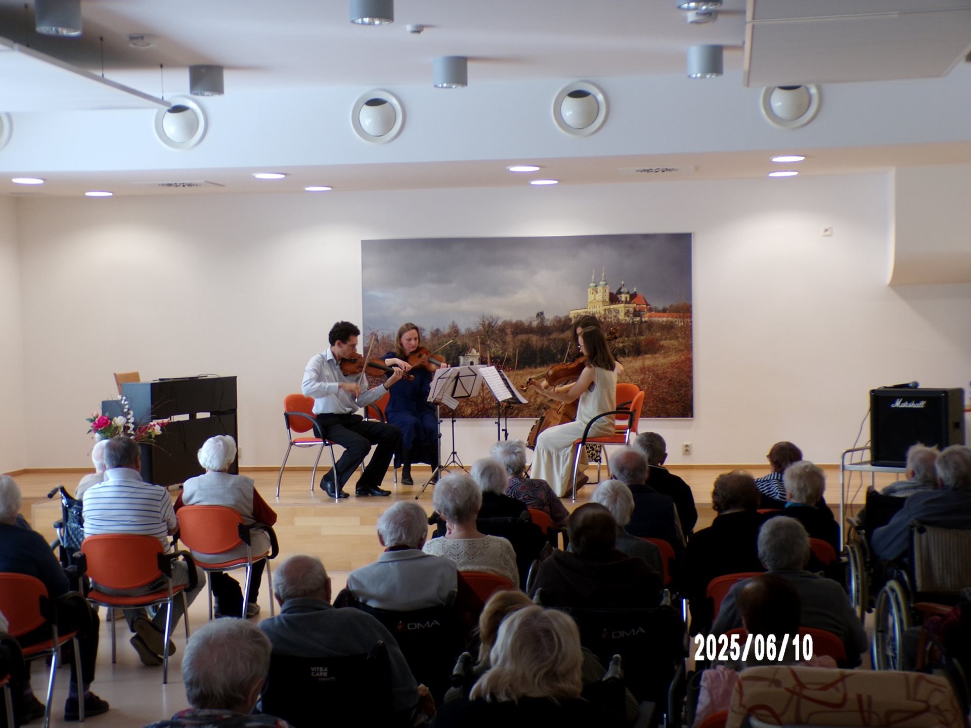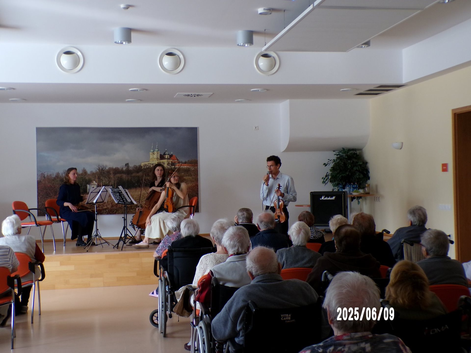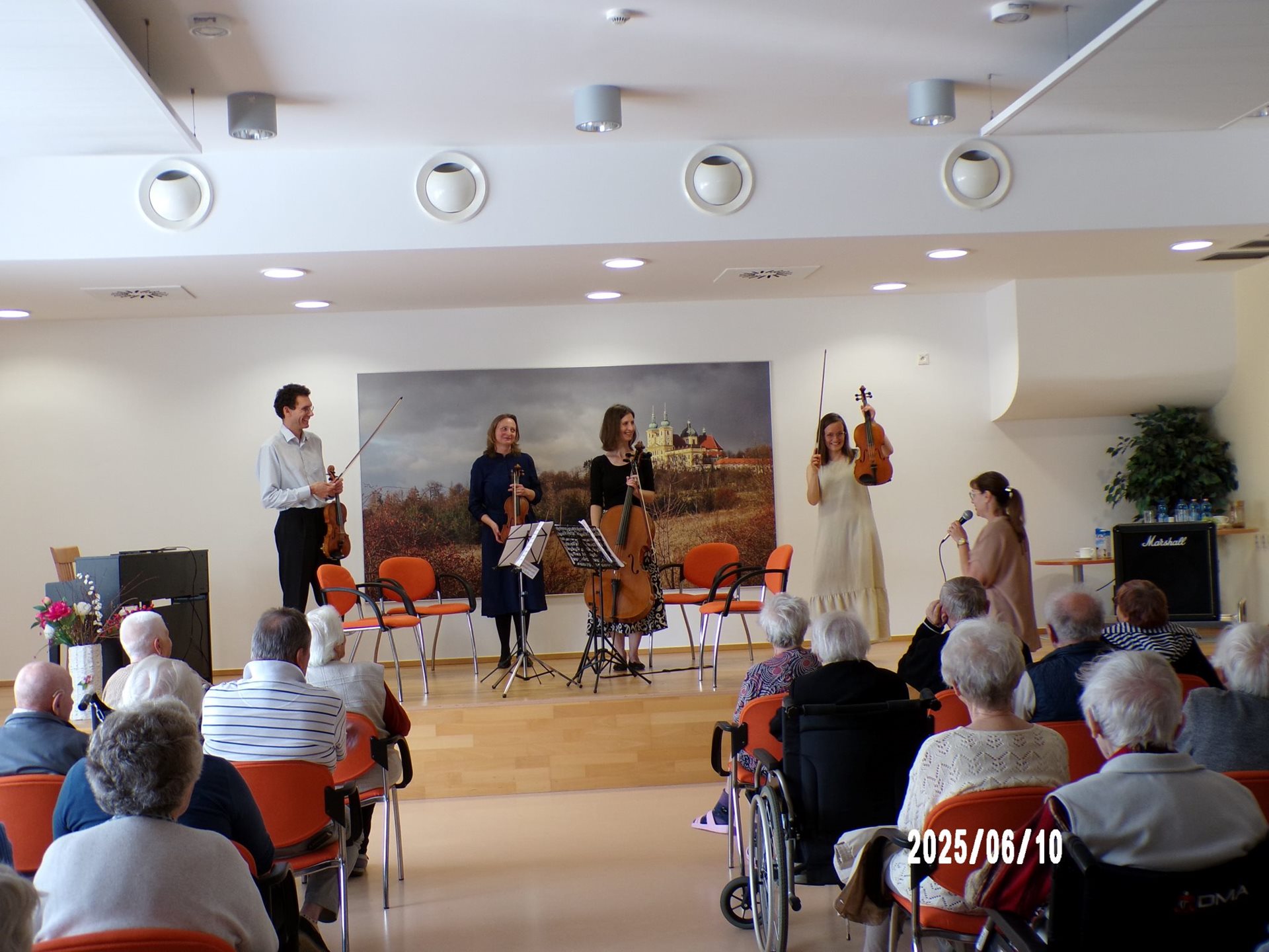 Dnes klienti prožili dopoledne s vážnou hudbou. Členové souboru Karel Svačina, Milena Benešová (oba housle), Jitka Svačinová (viola), Hana Harnošová (violoncello) zahráli krásné skladby od klasických mistrů. Na závěr jsme se dozvěděli, jaký je rozdíl mezi violou a houslemi.