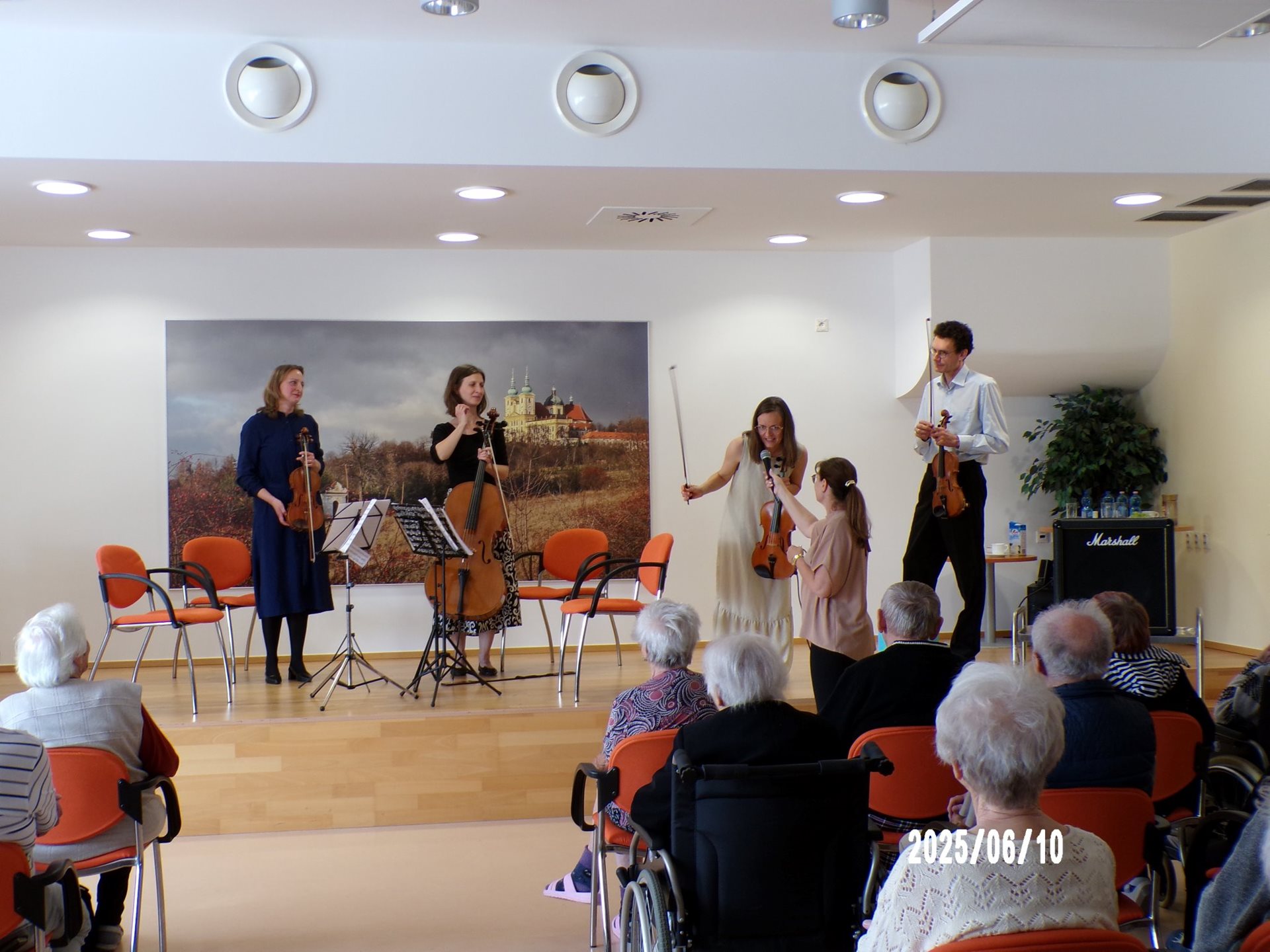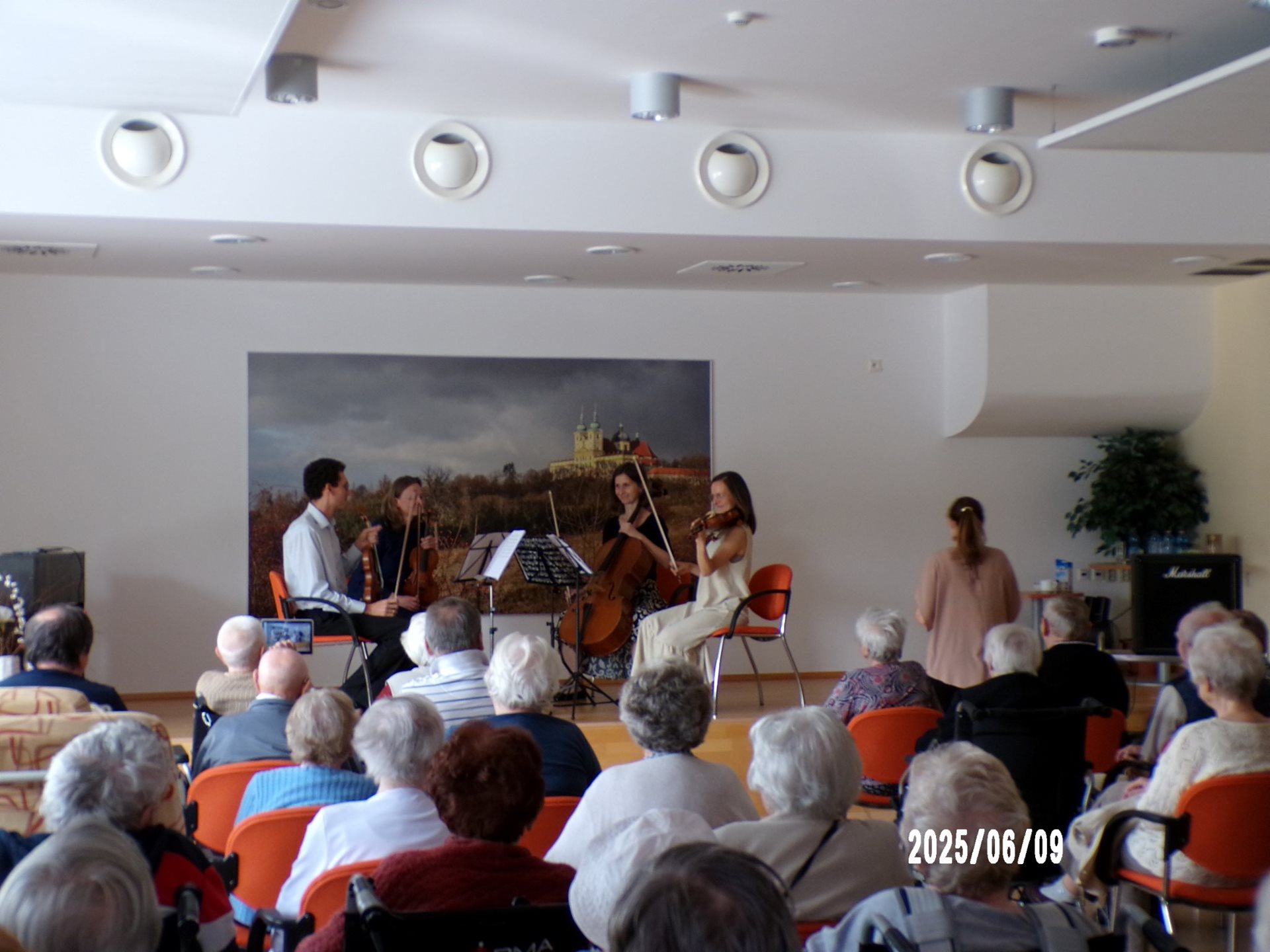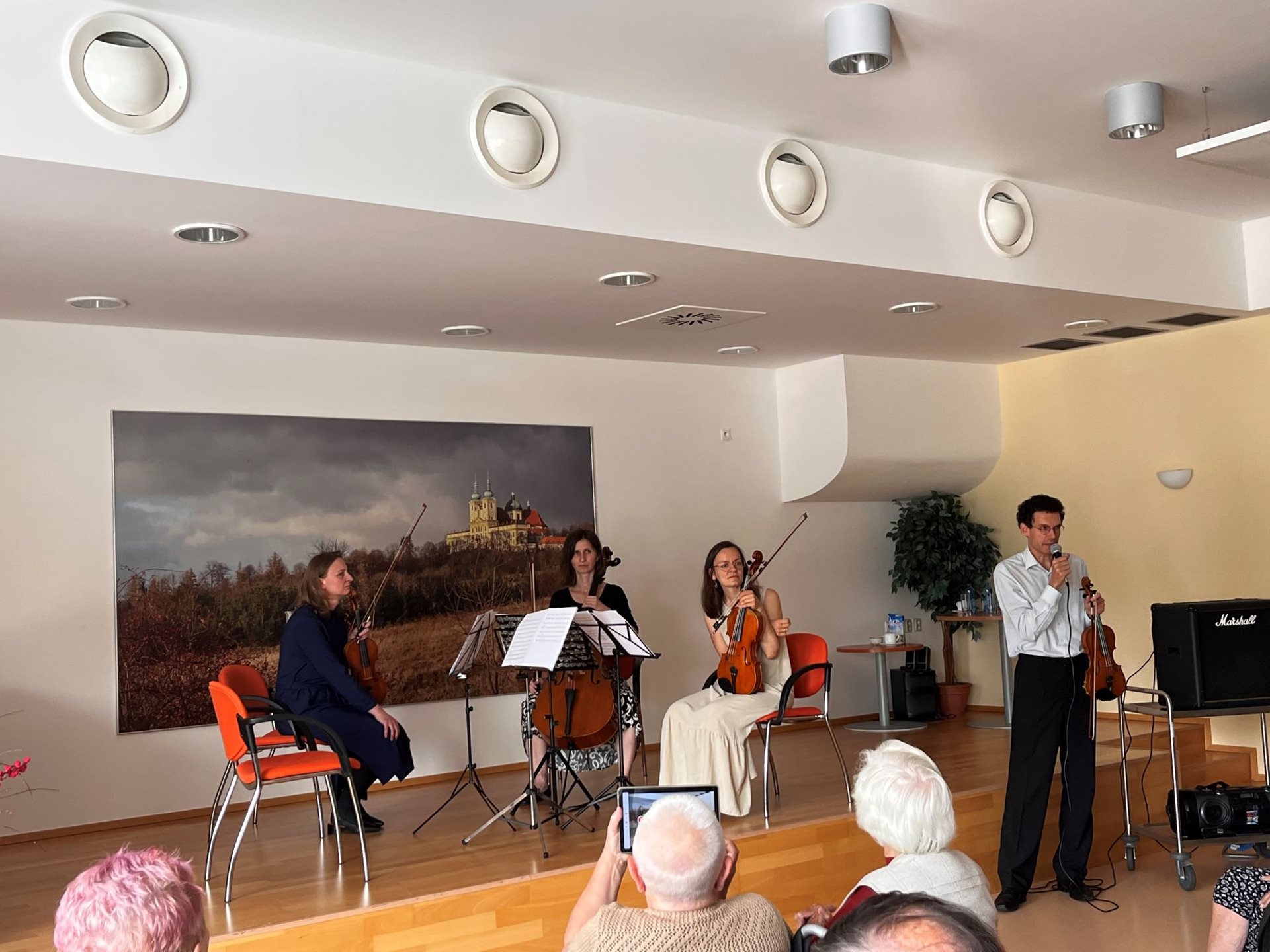 Dnes klienti prožili dopoledne s vážnou hudbou. Členové souboru Karel Svačina, Milena Benešová (oba housle), Jitka Svačinová (viola), Hana Harnošová (violoncello) zahráli krásné skladby od klasických mistrů. Na závěr jsme se dozvěděli, jaký je rozdíl mezi violou a houslemi.