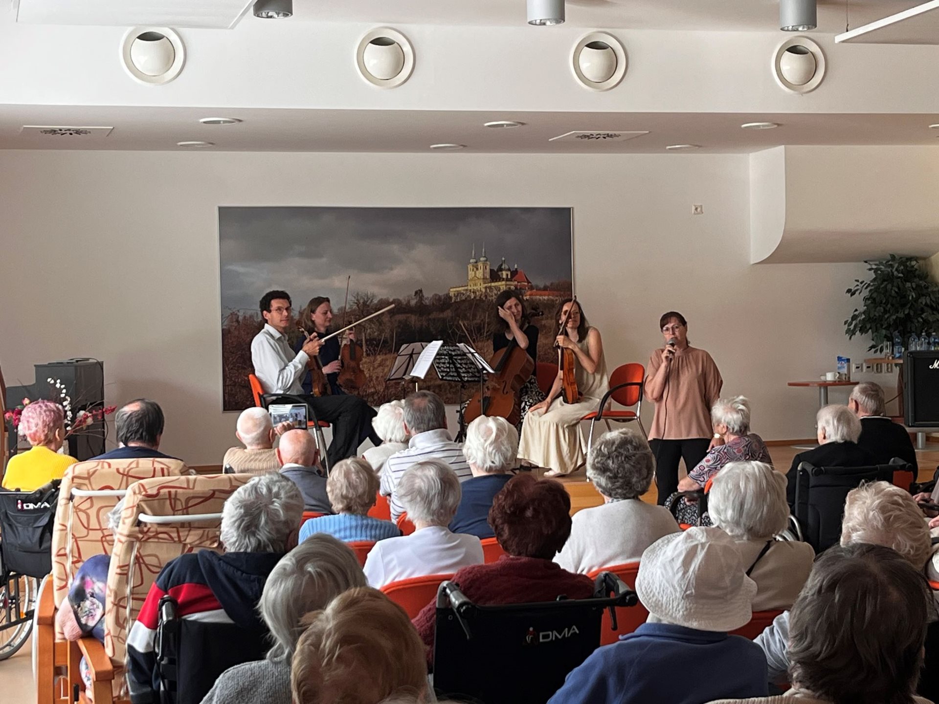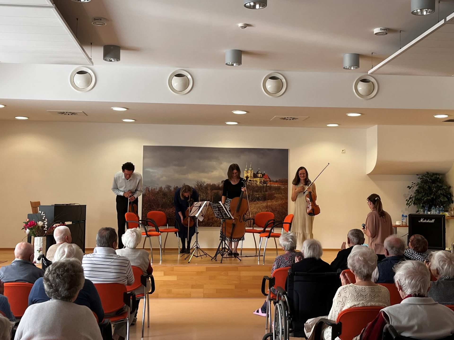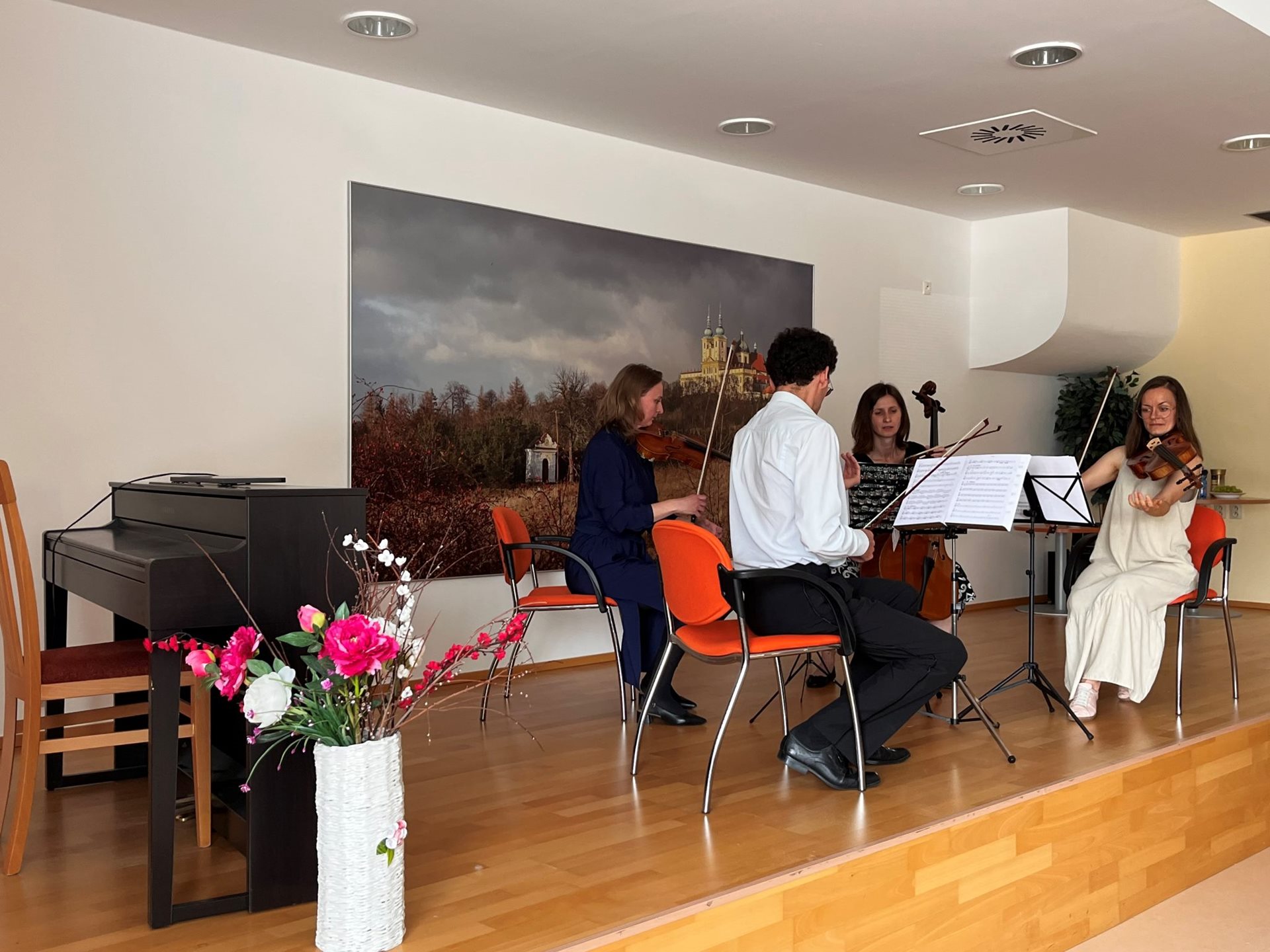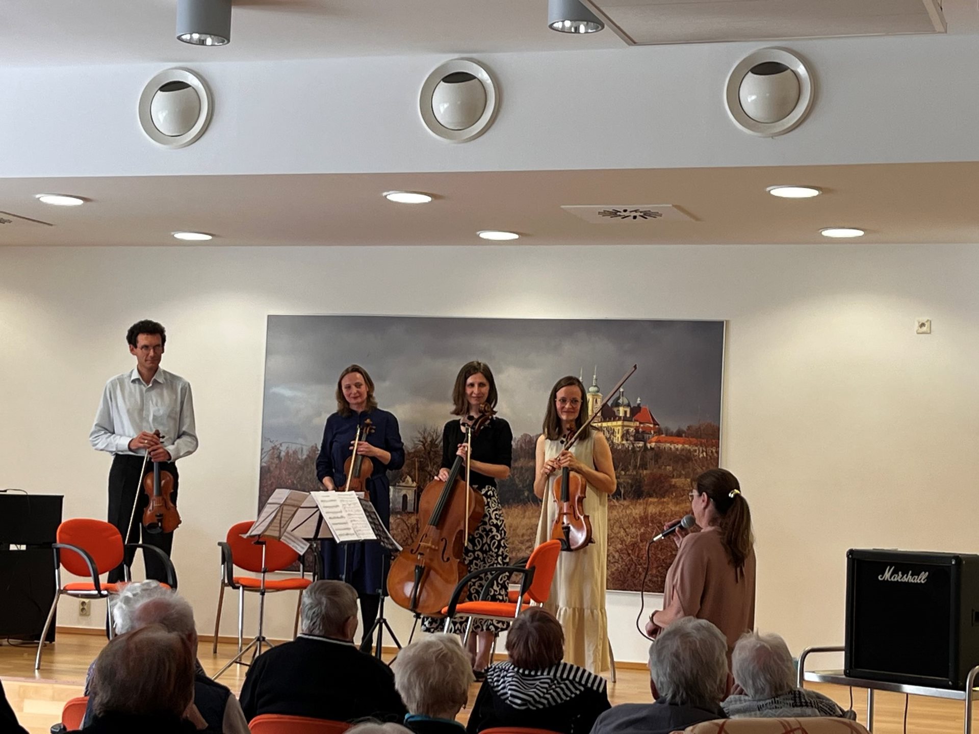 Dnes klienti prožili dopoledne s vážnou hudbou. Členové souboru Karel Svačina, Milena Benešová (oba housle), Jitka Svačinová (viola), Hana Harnošová (violoncello) zahráli krásné skladby od klasických mistrů. Na závěr jsme se dozvěděli, jaký je rozdíl mezi violou a houslemi.