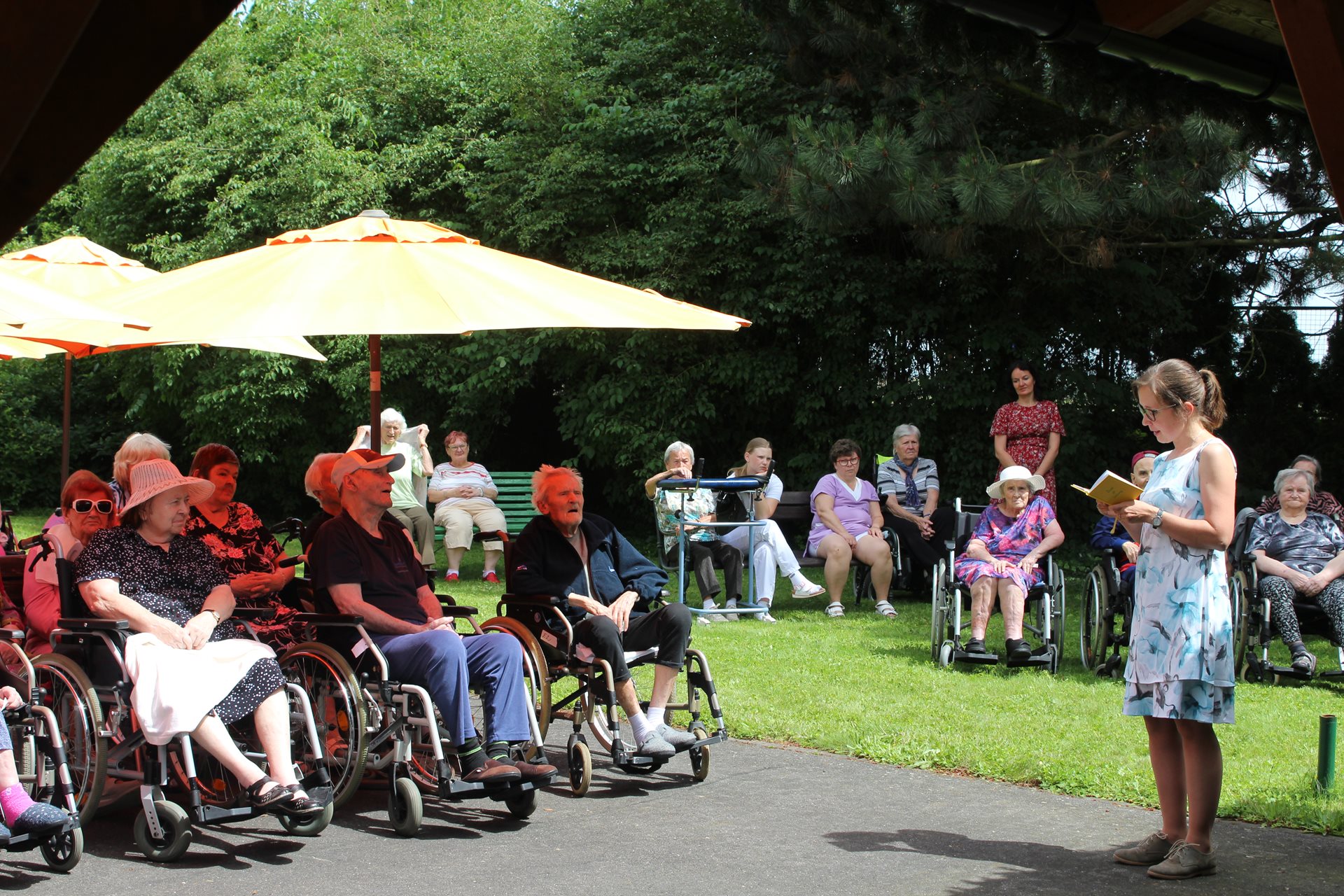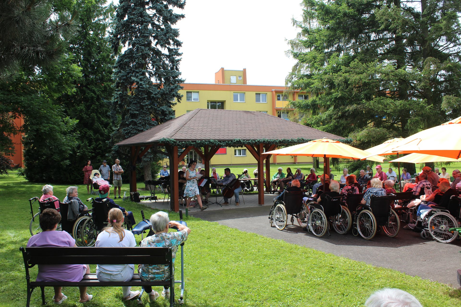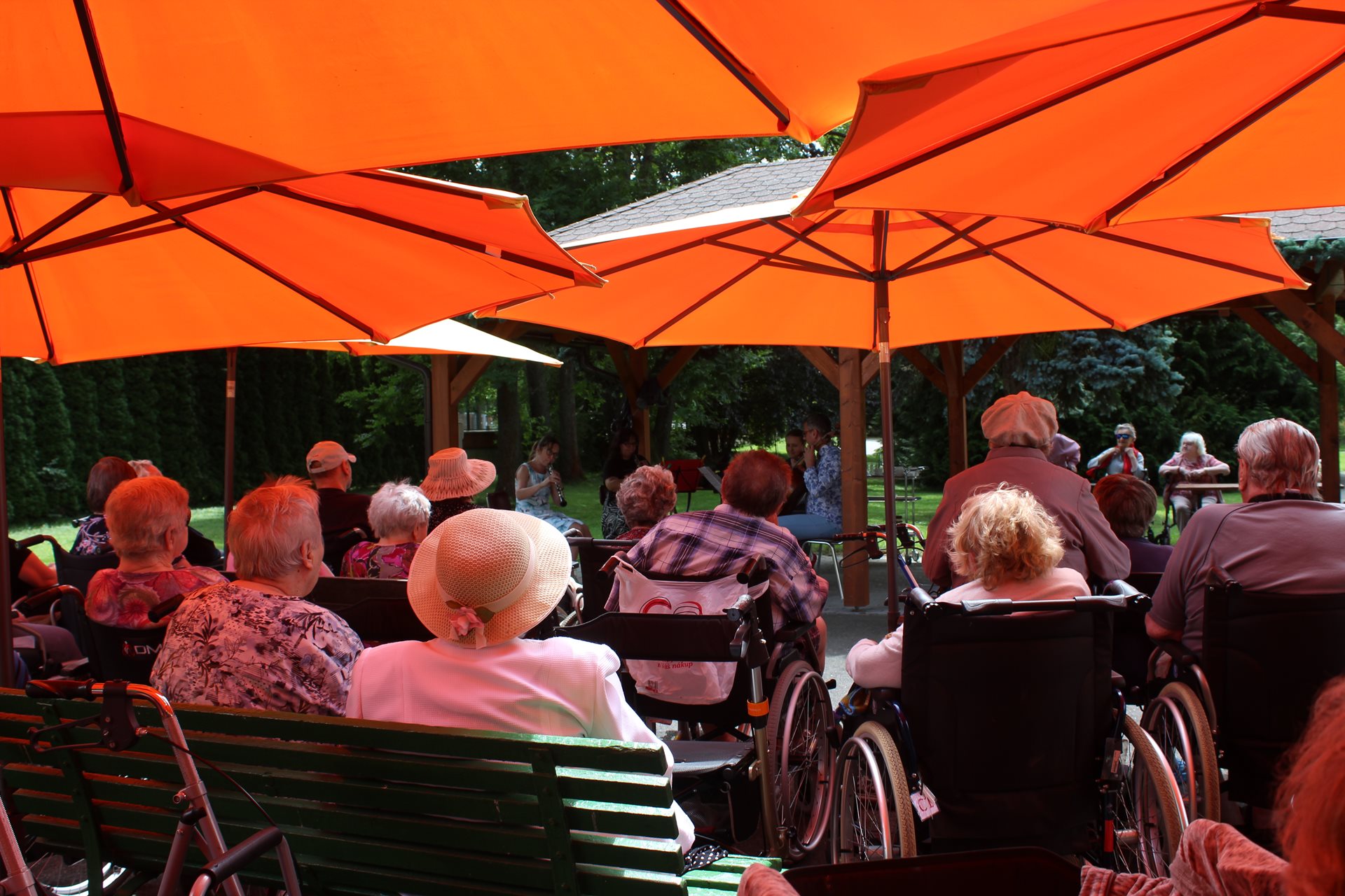 Navštívil nás kvartet Amicita, složený ze dvou dechových a dvou smyčcových nástrojů, pod oranžovými slunečníky vytvořil atmosféru jako na lázeňské kolonádě. Vážná hudba se linula vzduchem a připomínala kouzlo starých promenád, kde se vzletná melodie dotýká duše. Jedna z členek souboru recitovala básně, což dodalo akci poetický nádech. Komorní atmosféra vytvořena vážnou hudbou a dokonalé počasí učinily z tohoto odpoledne nezapomenutelný zážitek. Děkujeme všem a těšíme se na další přislíbené setkání.