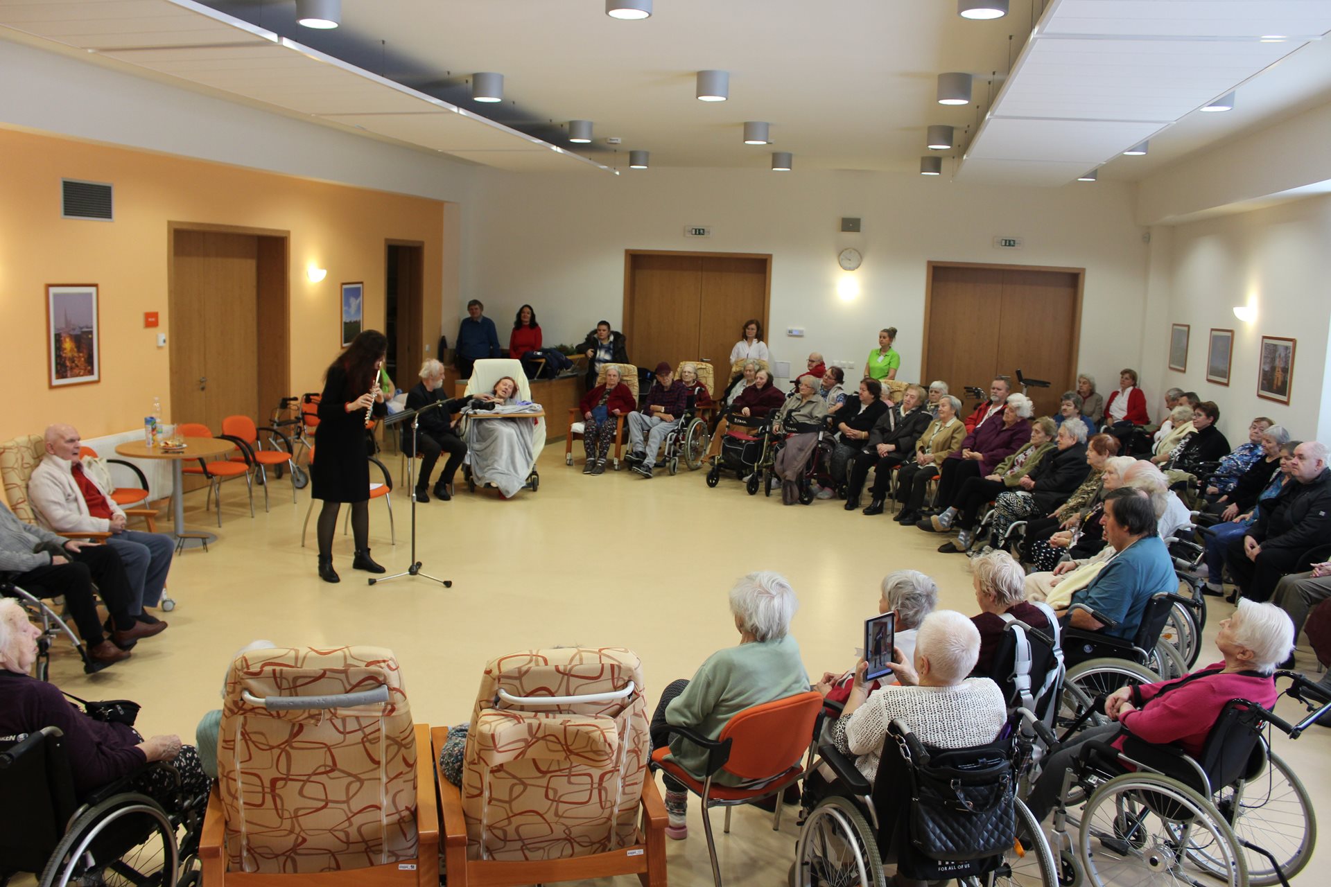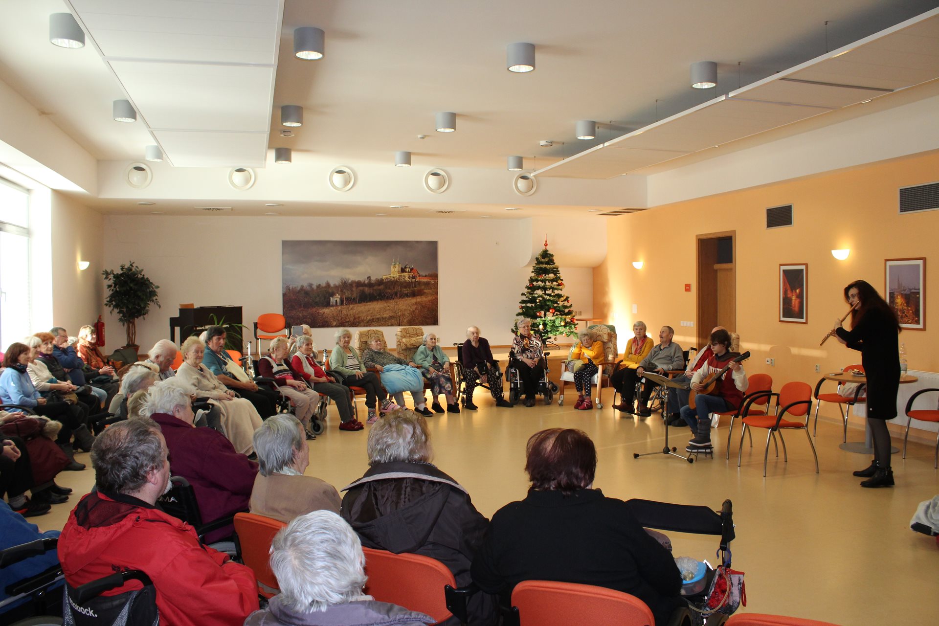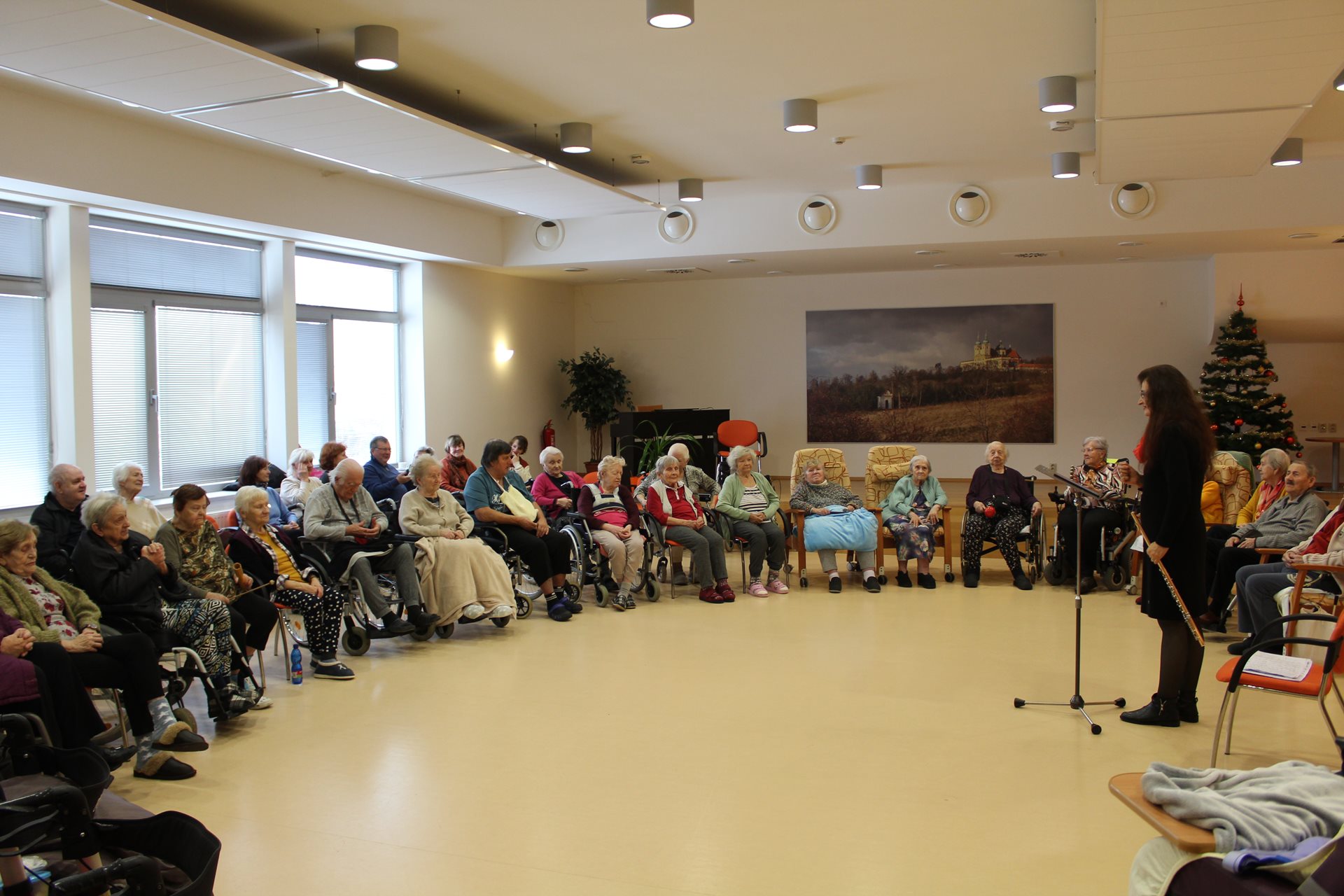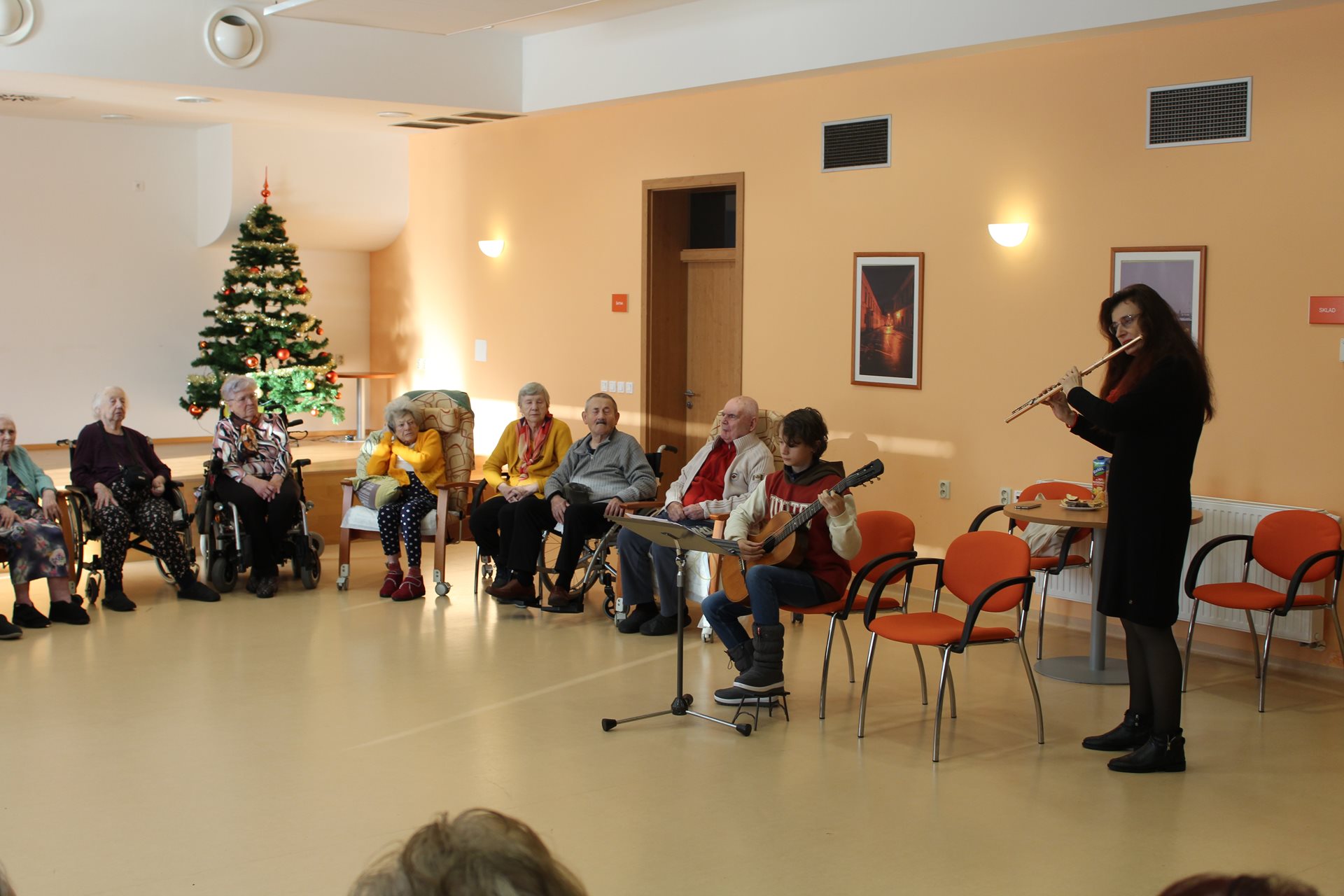 Dopoledne u nás se neslo na vlnách hudebního kouzla, které přivezla virtuózka příčné flétny Monika Duarte Štreitová se svým synem, který jí doprovázel na kytarové struny. Z dalekého Portugalska k nám přinesli melodie, jež pohladily duši a rozzářily tváře. Klienti, usazeni v půlkruhu, měli díky paní Monice možnost sami přispět drobnými nástroji a stát se součástí této harmonie. Monika nejen hrála, ale i zpívala vánoční koledy, které nás všechny spojily v radosti a svátečním klidu. Bylo to dopoledne naplněné hudbou, emocemi a kouzlem vzájemnosti.