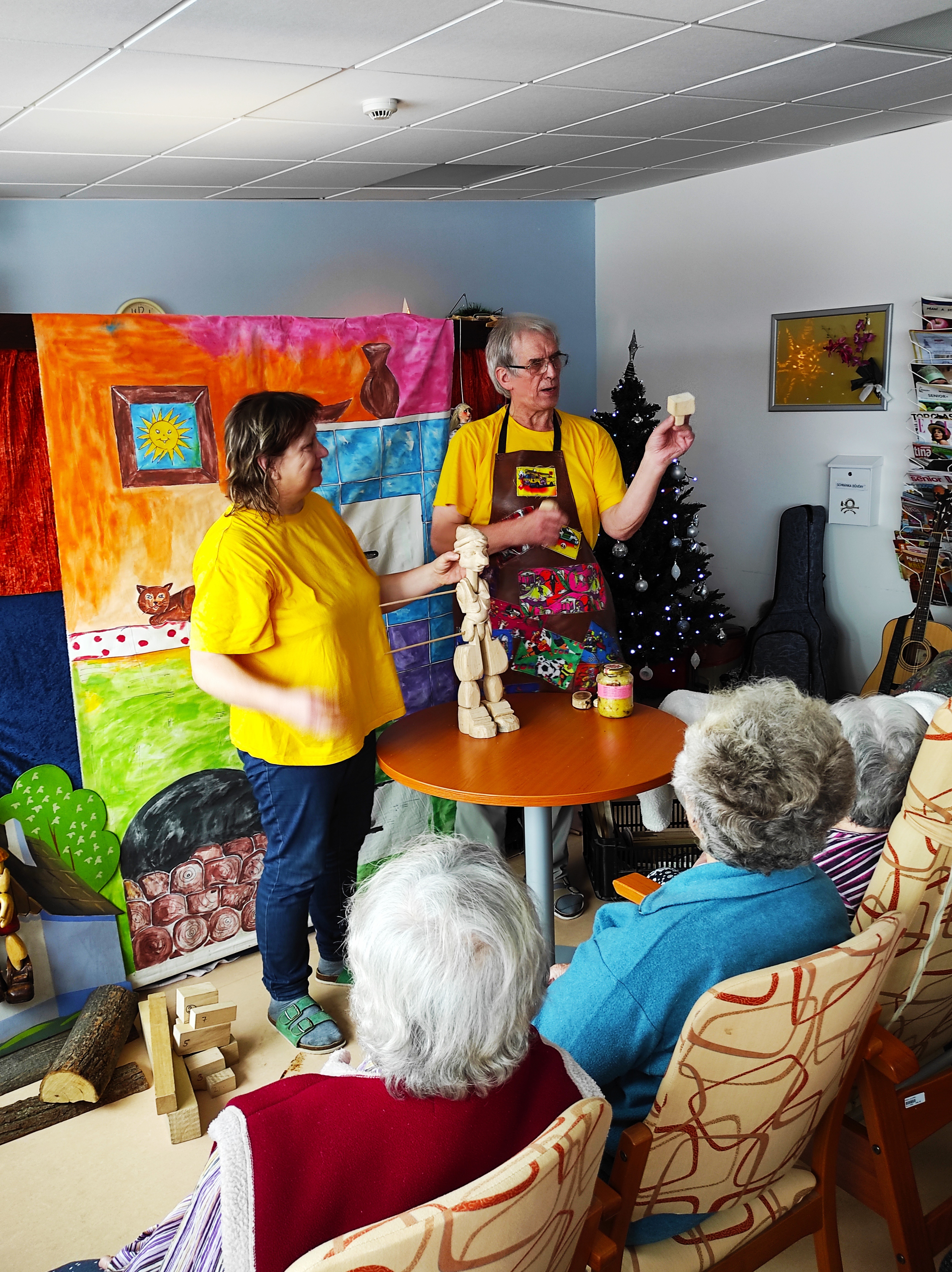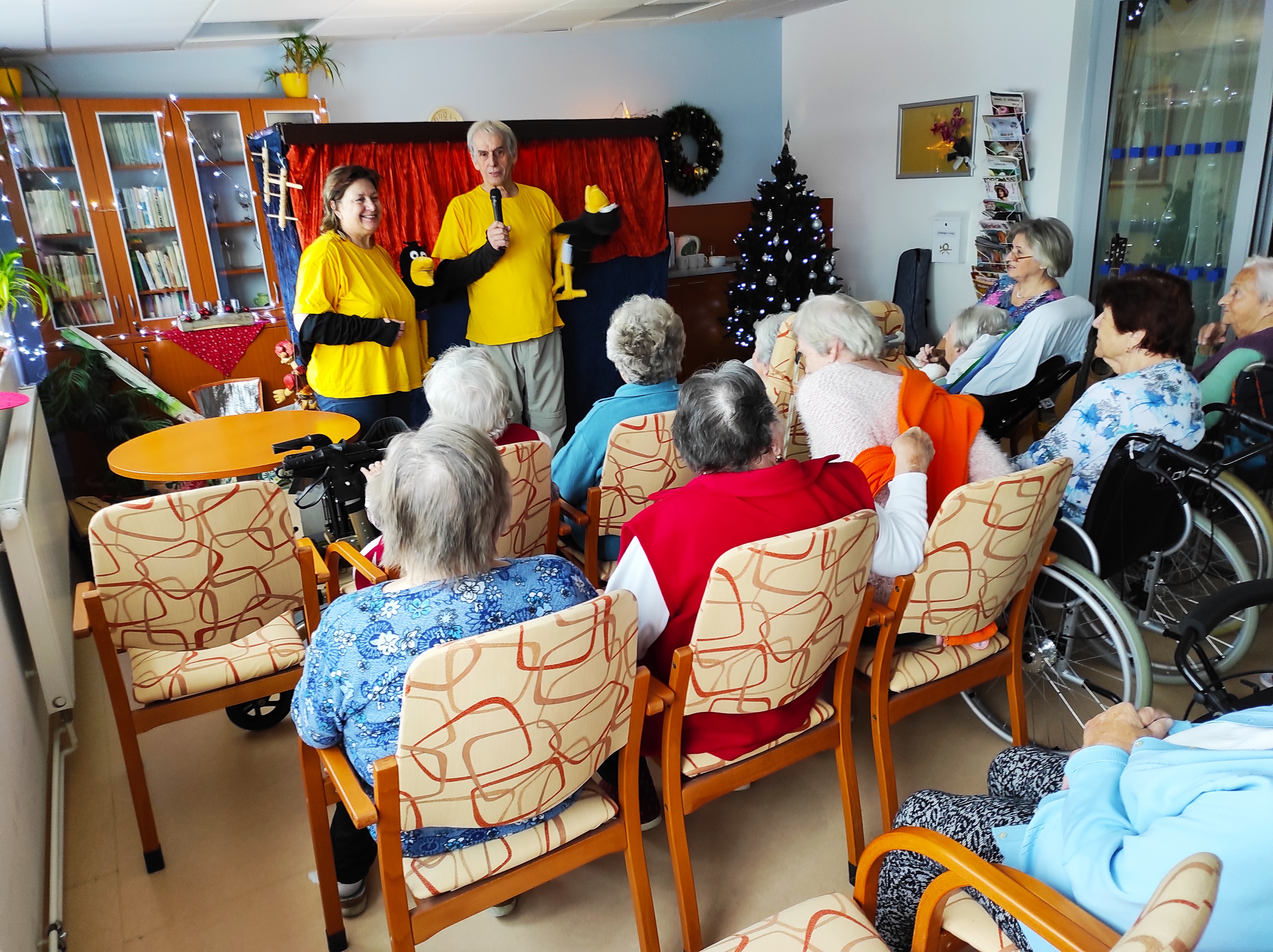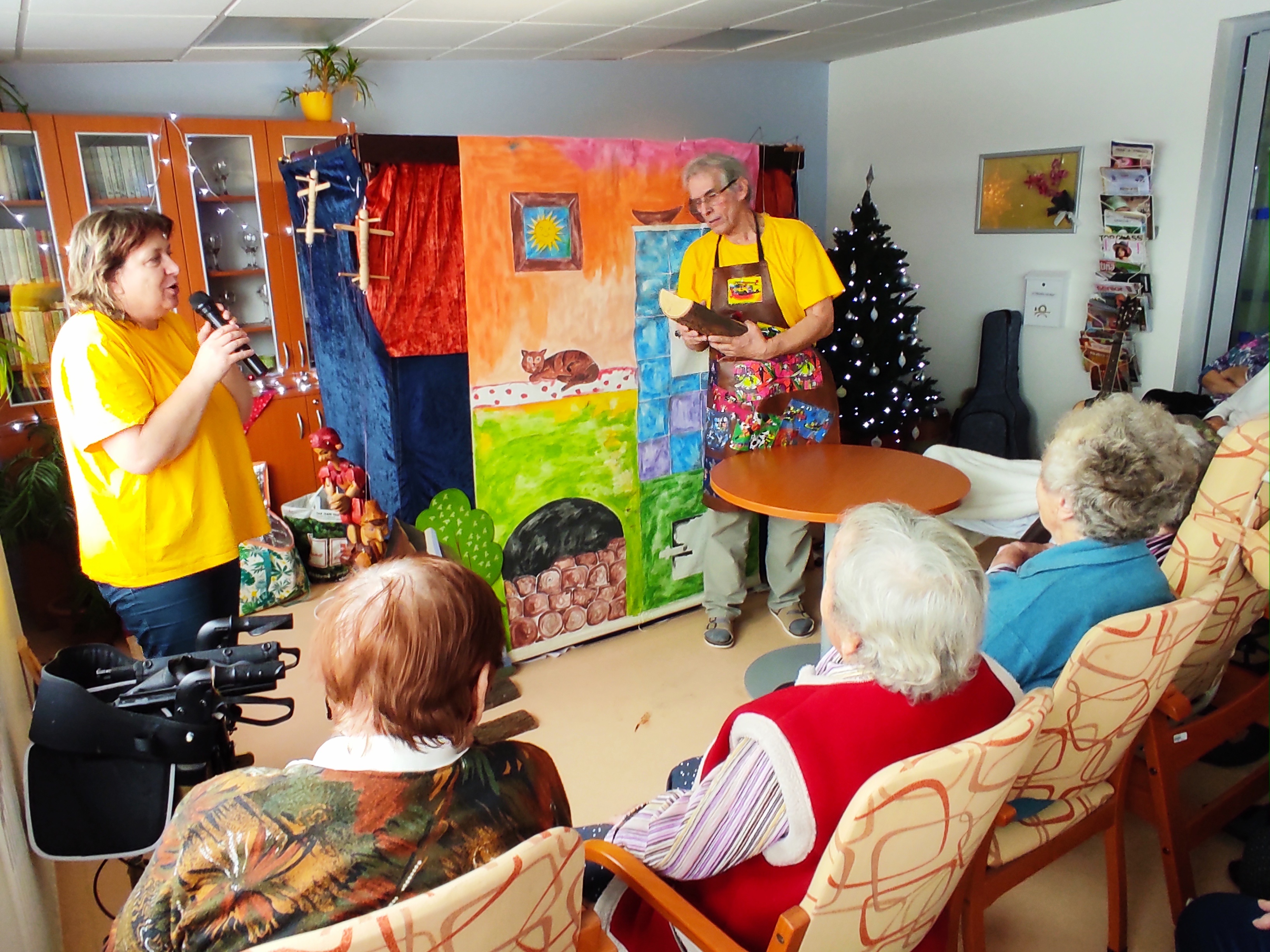 Manželé Janečkovi navštívili oddělení C3 a C4 se svými loutkami. Přinesli mnoho marionet i maňásků. Zahráli našim klientům tři pohádky. Pan Janeček vyrábí dřevěné loutky a klientům ukázal, jak tvorba probíhá. Nakonec jsme si všichni zazpívali v doprovodu kytary p. Janečka.