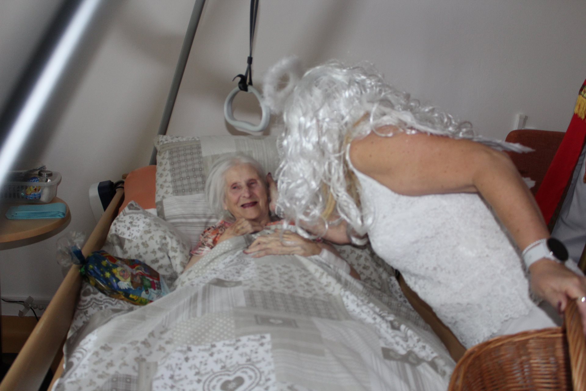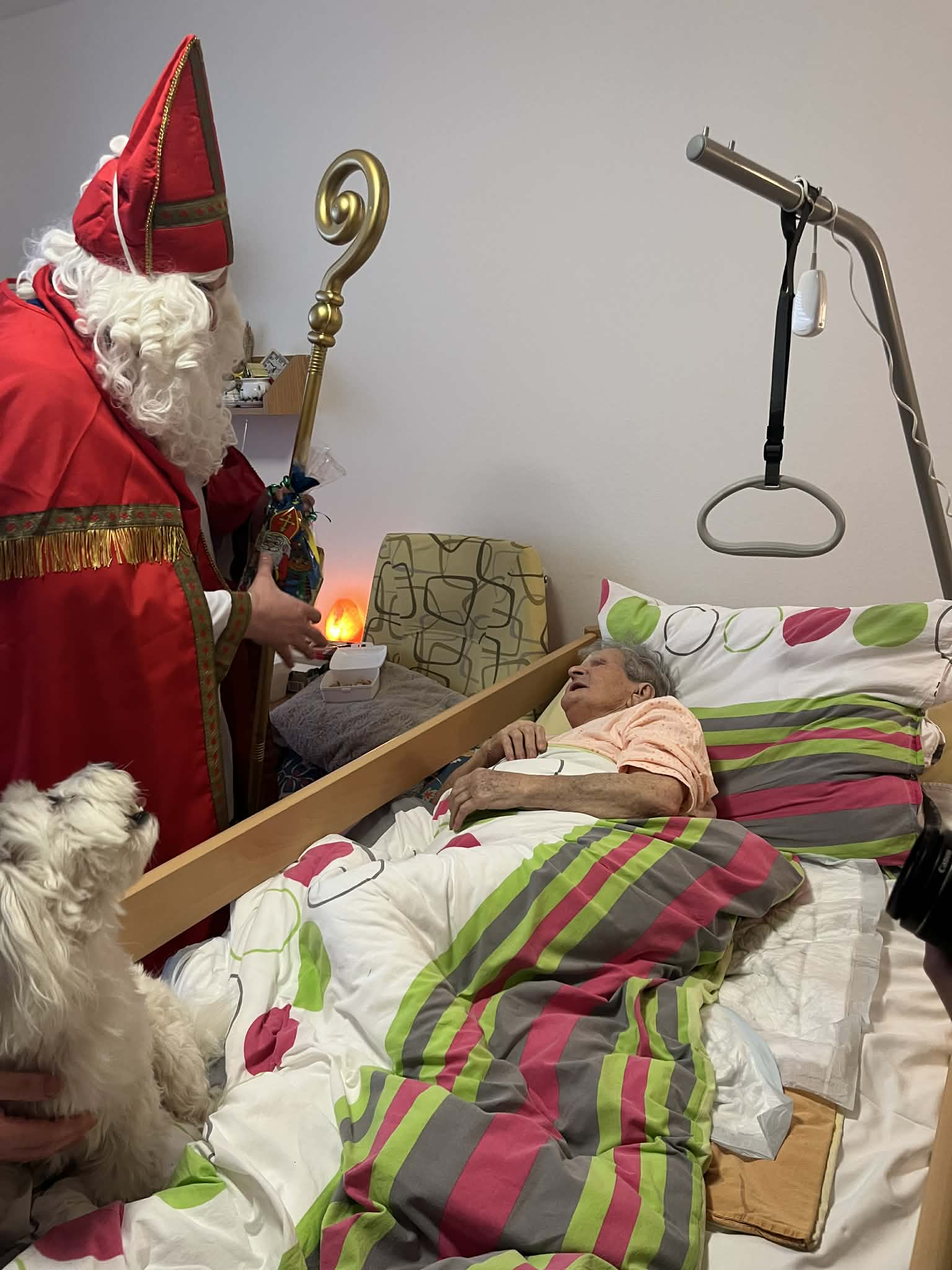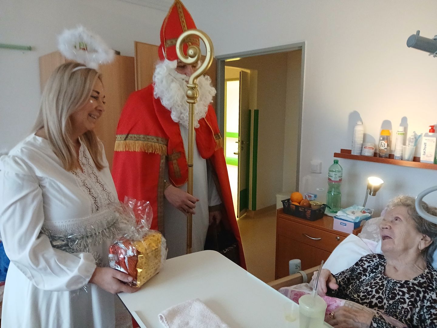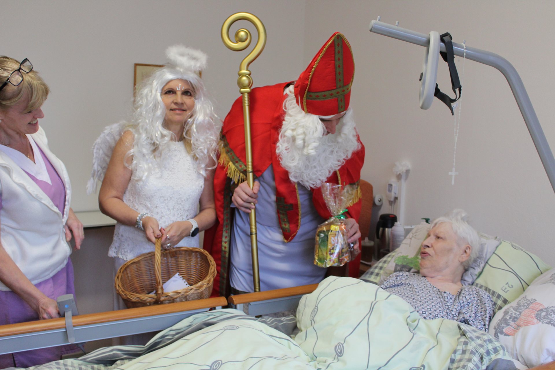 Mikulášská trojice nezapomněla ani na imobilní klienty. Za těmi se vydala přímo na pokoje, aby i oni mohli prožít radostné chvíle a osobní setkání.