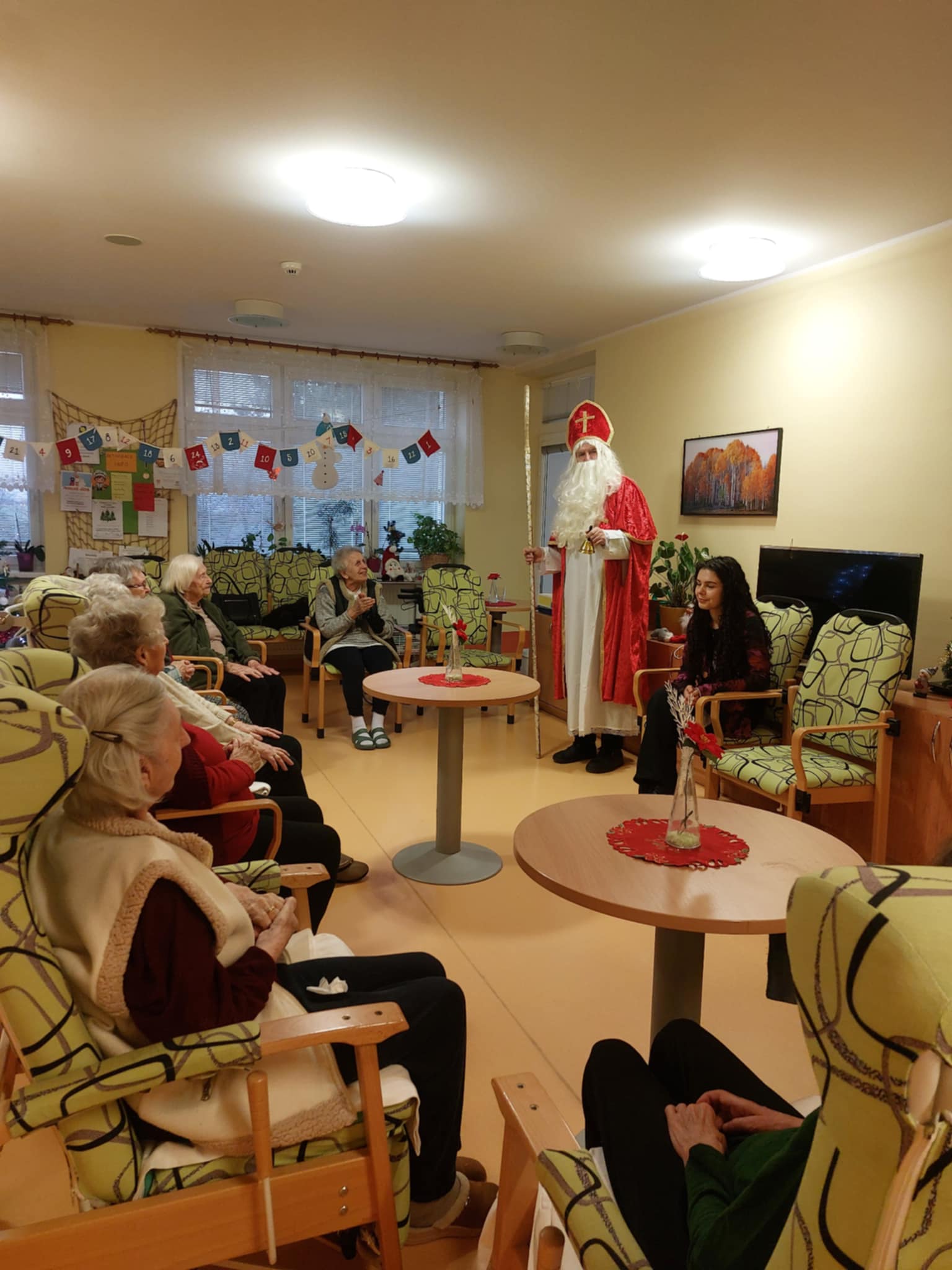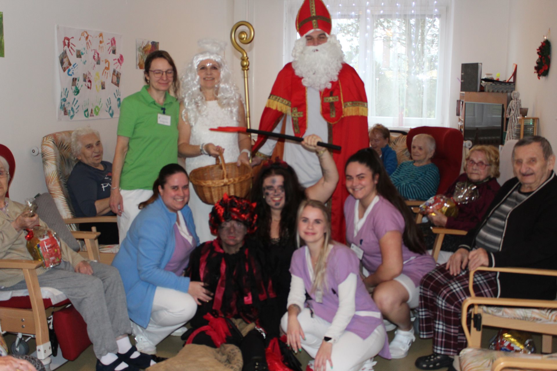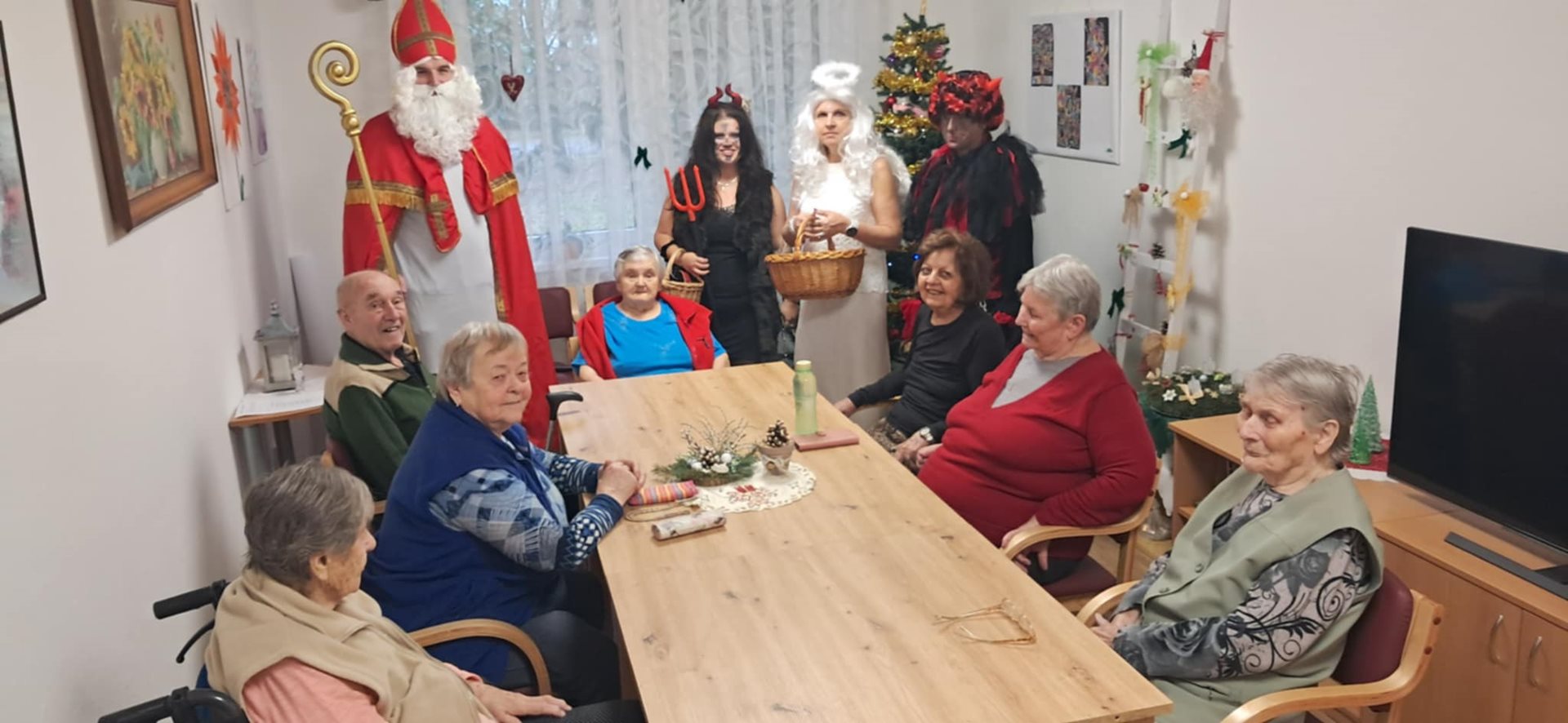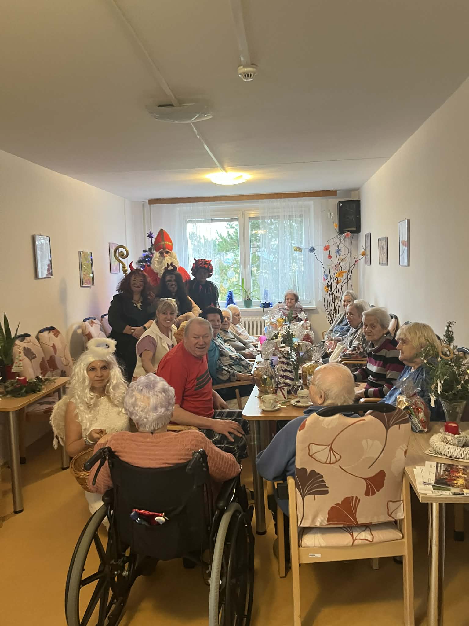 V našem domově navštívil klienty personál v rolích MIKULÁŠE, ČERTA A ANDĚLA. Ve společenských místnostech jednotlivých oddělení rozdával klientům připravené balíčky. Ke svátečnímu setkání patřila také tradice – od klientů jsme si vyslechli básničku nebo písničku, což přineslo mnoho úsměvů i dojemných chvilek.