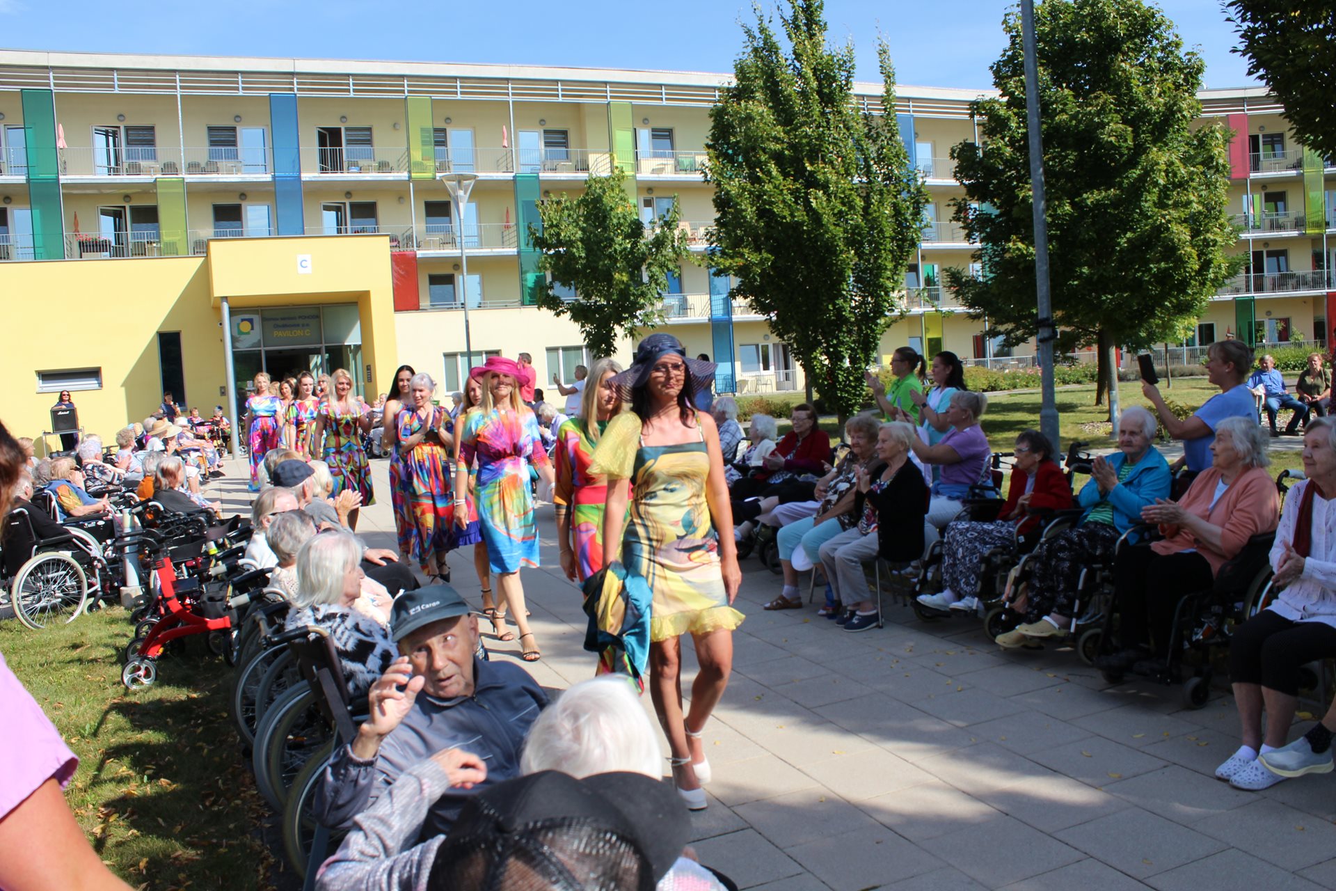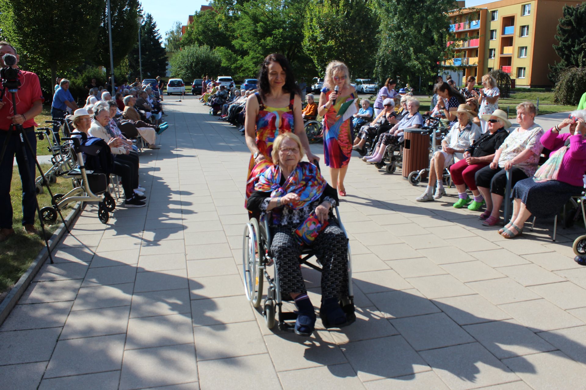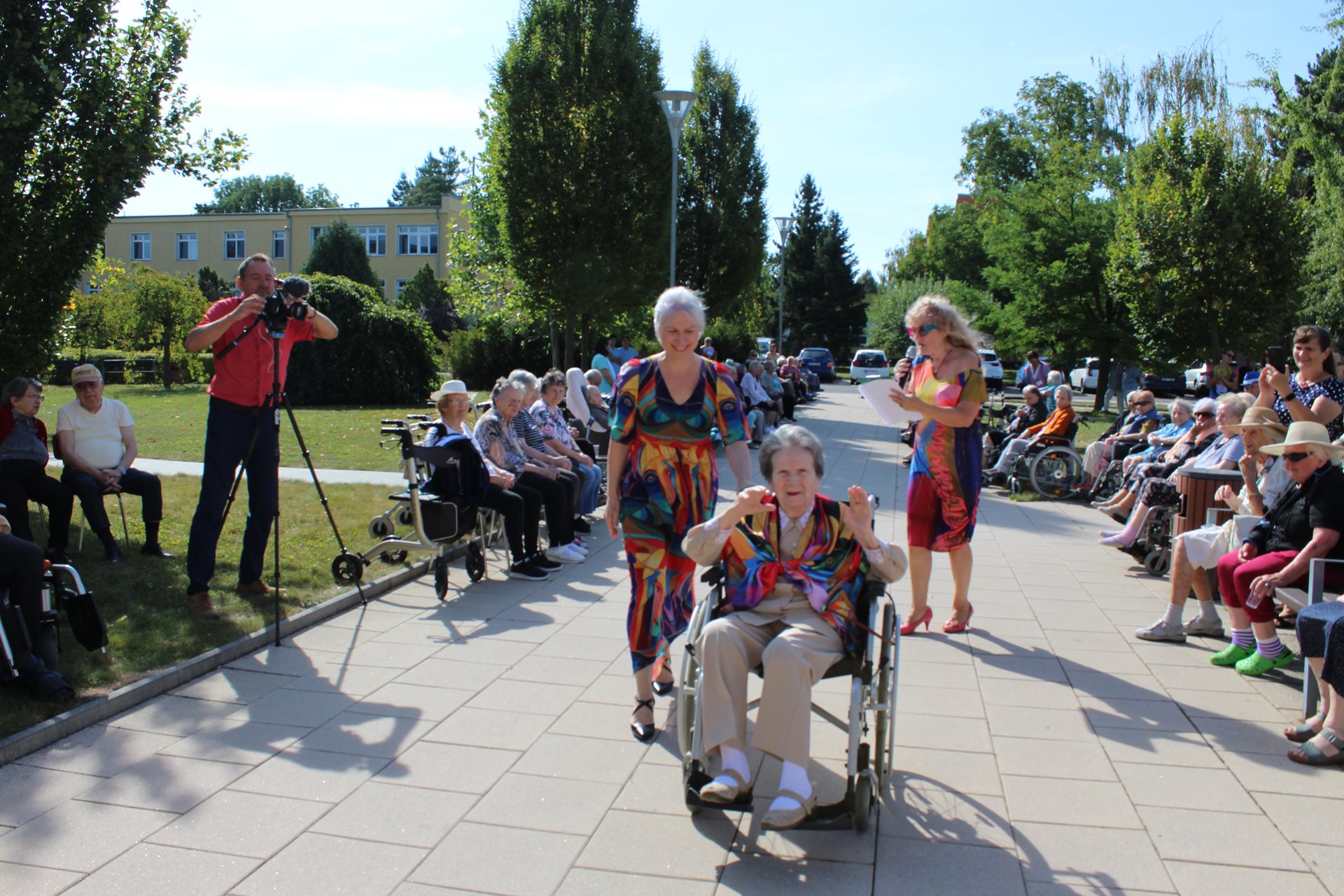 Začátkem září jsme si užili slunečné dopoledne plné barev, úsměvů a radosti. Pod vedením módní návrhářky a výtečné malířky Aleny Cikové se u nás představily nádherné letní modely v pestrých barvách. Na improvizovaném mole před pavilónem C se vždy objevil jeden z našich klientů v doprovodu pracovníka, za bouřlivého potlesku a nadšených úsměvů publika. Celým programem provázela paní Helena Peštuk Sedláčková, která svým mluveným projevem akci dodala správný šmrnc. Byl to krásný závěr léta, na který budeme dlouho vzpomínat.