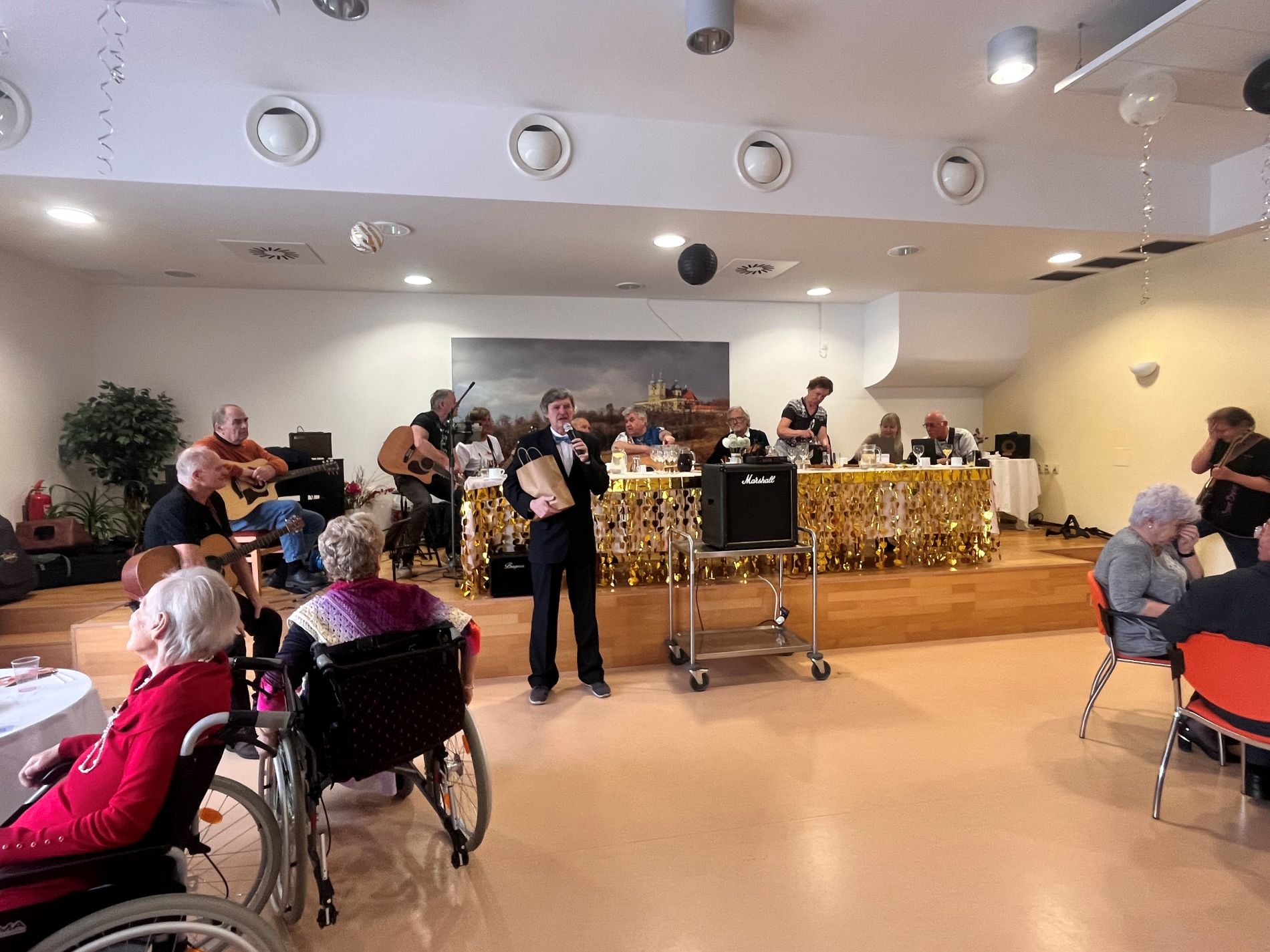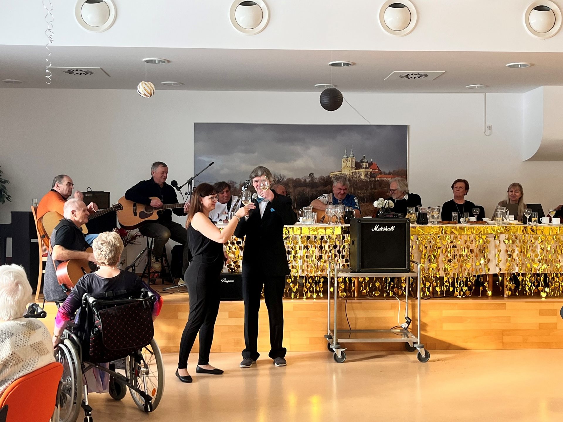 Dnes jsme na budově C završili čas hodování. Zaměstnanci a klienti se nastrojili, přijela kapela a začal společenský ples - hudba, tanec, víno a zpěv. Pár šťastných vyhrálo i v tombole!