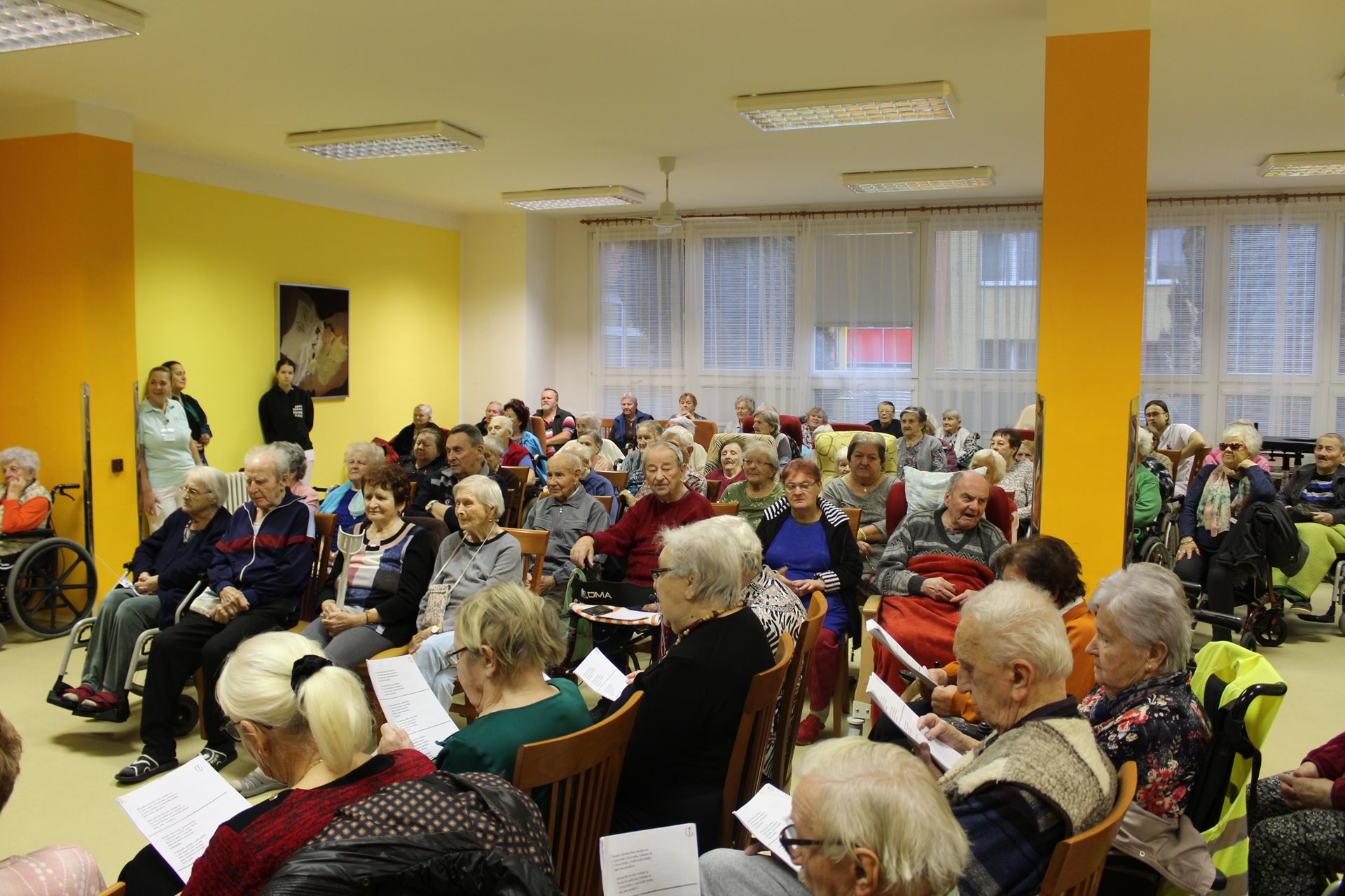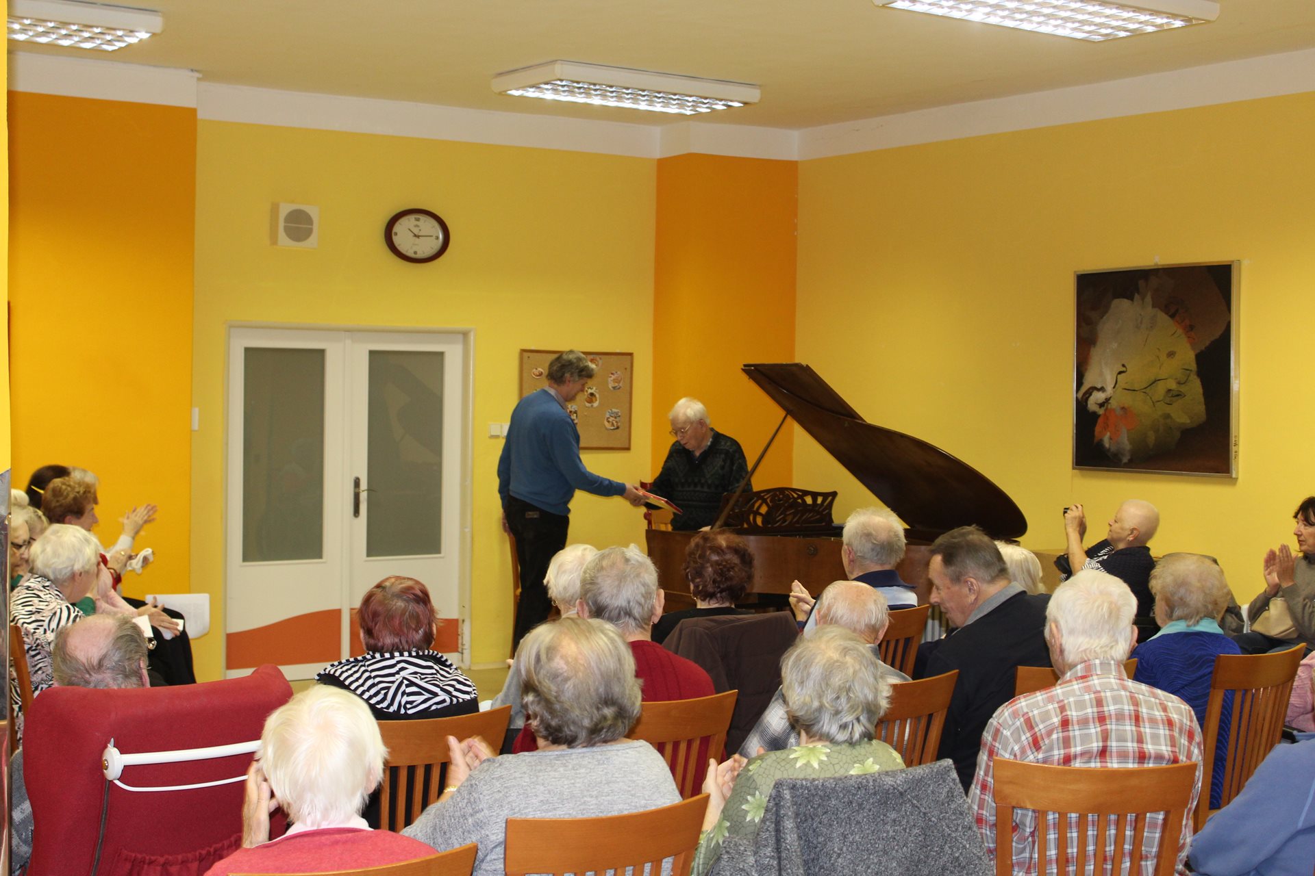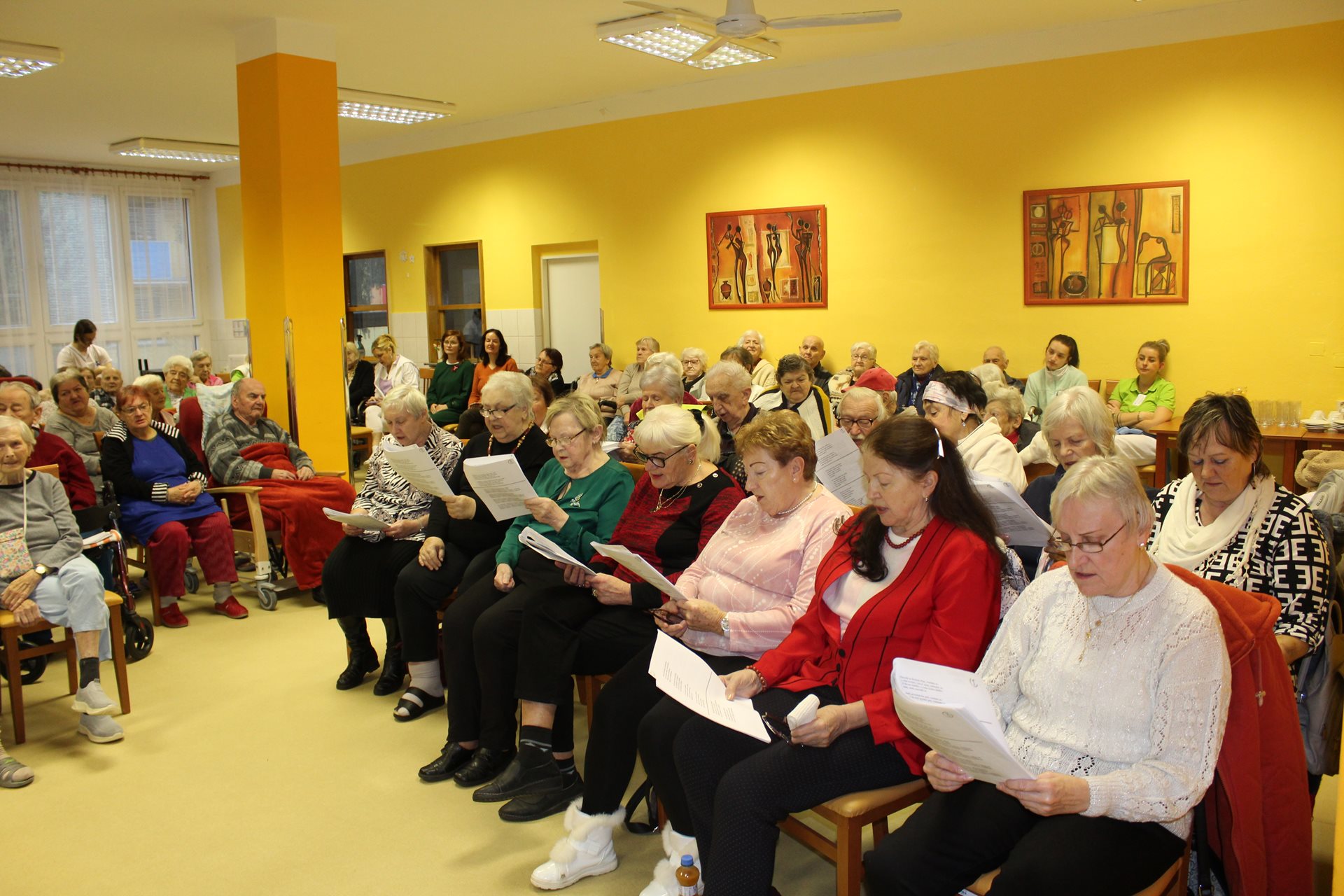 Na budově D našeho Domova zazněly vánoční koledy v poledním čase, kdy nám pan Mather, náš téměř stoletý klient, se svým středečním pěveckým sborem připravil nezapomenutelný hudební zážitek. Pan Mather svým mistrovským přednesem na klavír doprovázel sbor, který pravidelně zkouší v našem Domově, a společně vykouzlili jedinečnou atmosféru. Celý sál se spontánně přidal ke zpěvu, a poledne se tak proměnilo v chvíle plné melodii, známých koled a vánoční pohody.