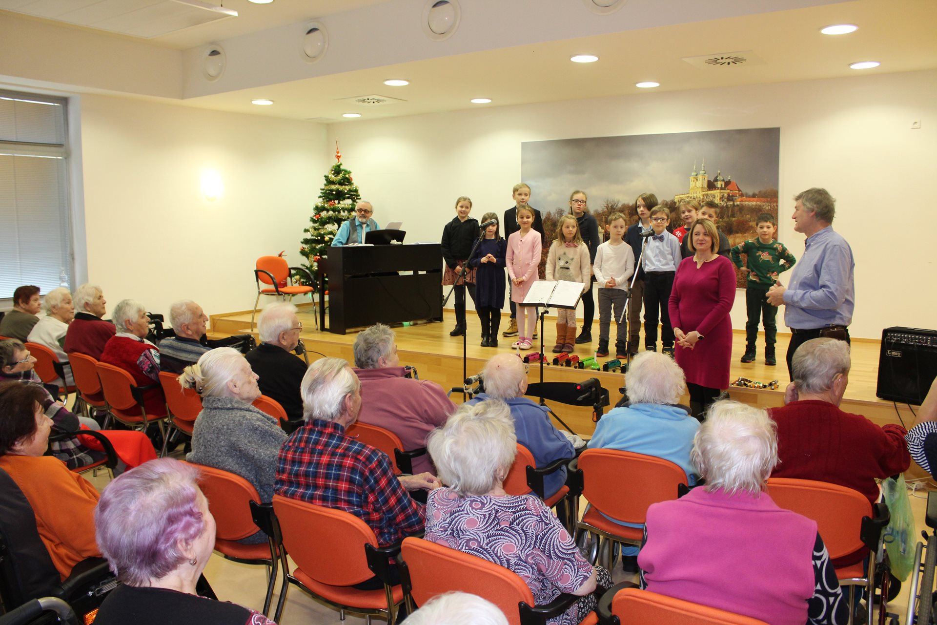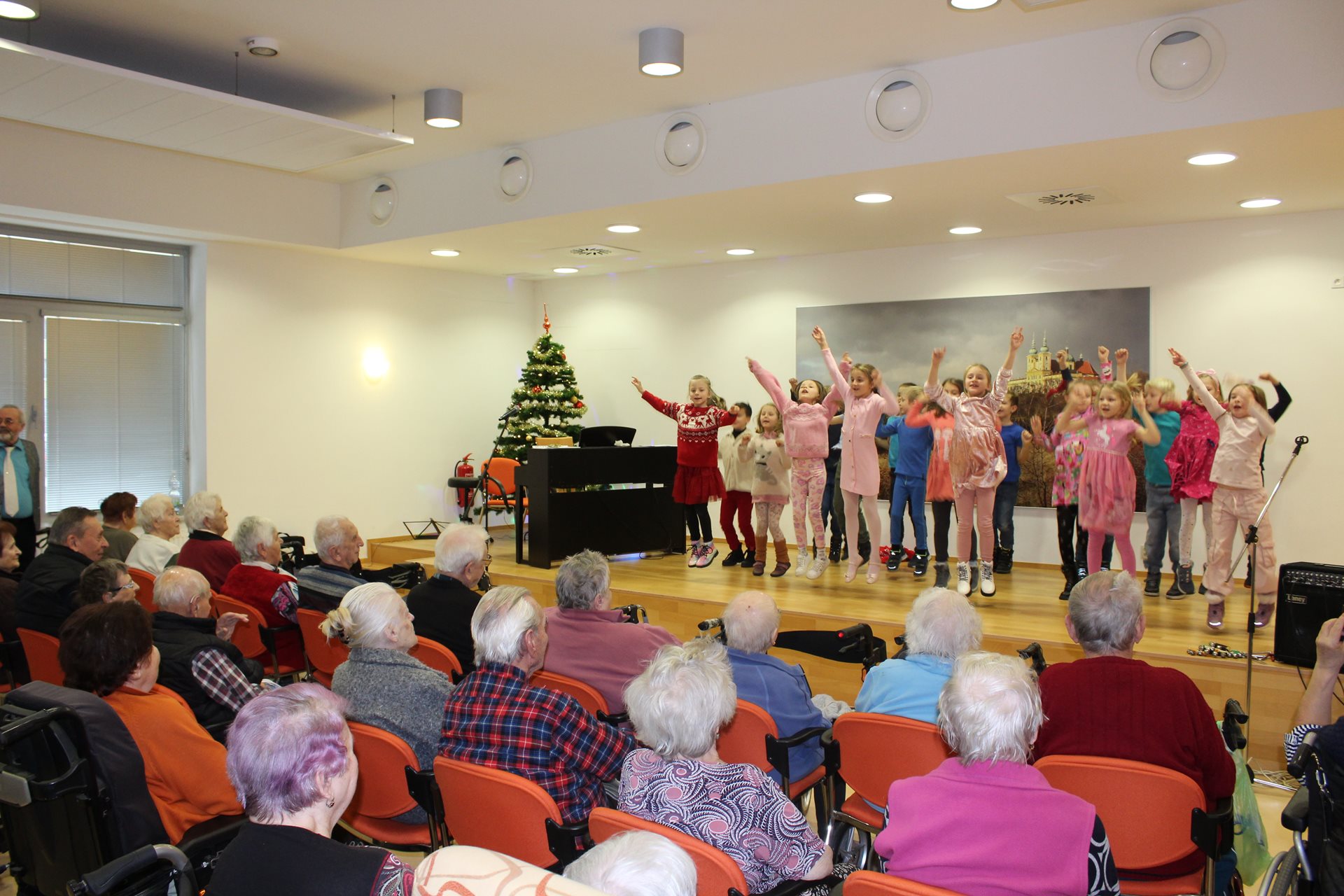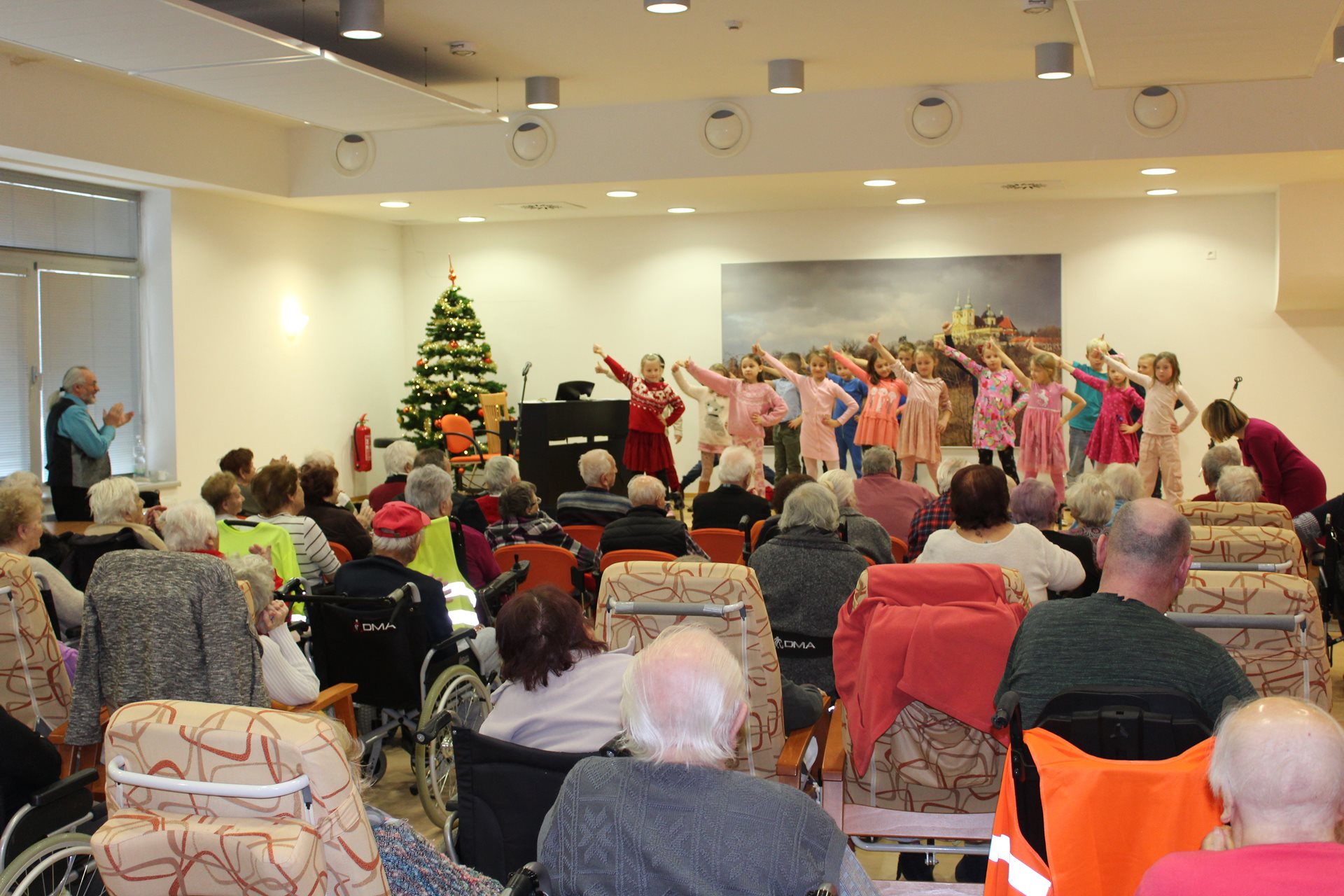 V mrazivém dopoledni se sál C našeho Domova proměnil v oázu radosti a tepla. Koncert pana Ludvíka, doprovázeného svou talentovanou dcerou, která s jistotou dirigovala děti ze Základní školy Spojenců, byl plný hudby, tance a krásných básní. Děti svým vystoupením nejen rozzářily tváře našich seniorů, ale předaly jim i malé dárečky, které umocnily tuto laskavou a srdečnou atmosféru. Kontrast mladistvé energie a životní moudrosti vytvořil jedinečné spojení generací. Venku sice vládla zima, ale uvnitř bylo teplo – teplo lidské blízkosti, smíchu a společného sdílení těchto kouzelných okamžiků.