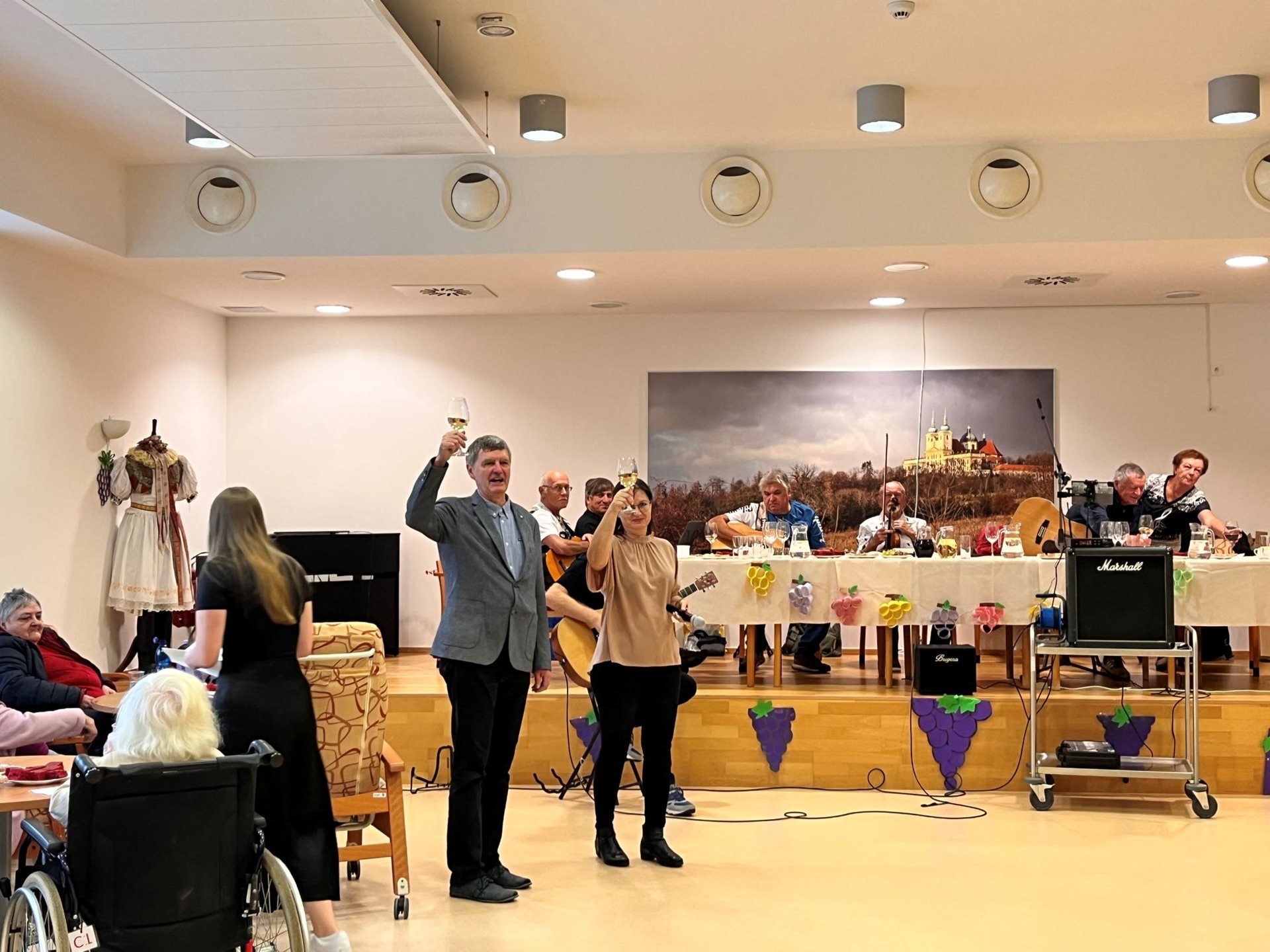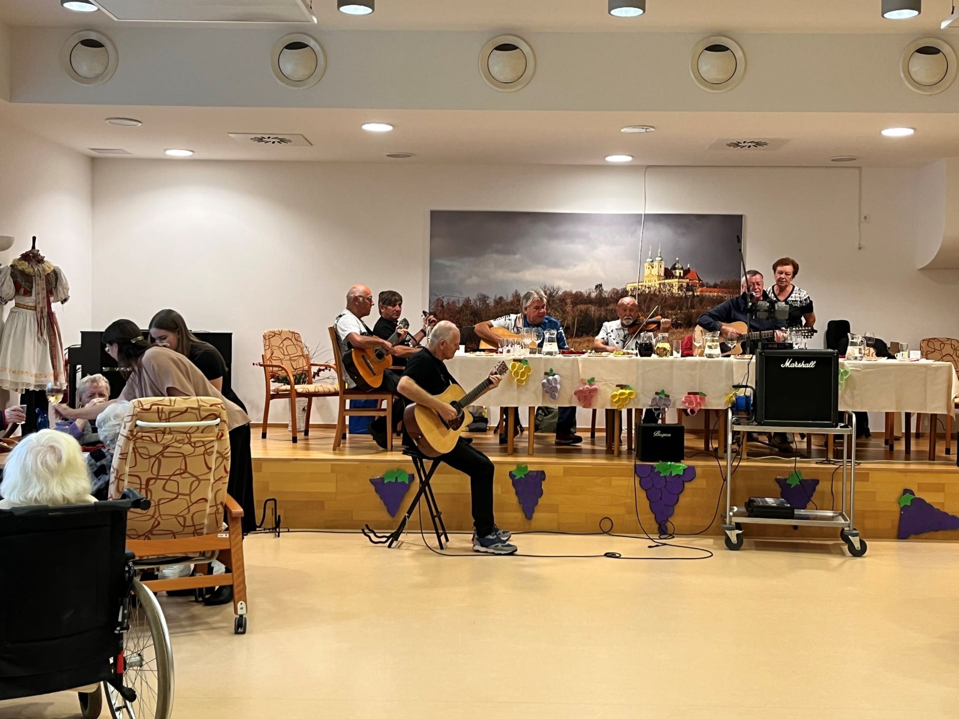 Dnes proběhlo v sále budovy C Vinobraní - oslava vína a radosti spojená s degustací vína, zábavou a s dobrým občerstvením. K tomu nám zahrála skupina Odpadlíci, která navodila atmosféru pohody, radosti a tance.